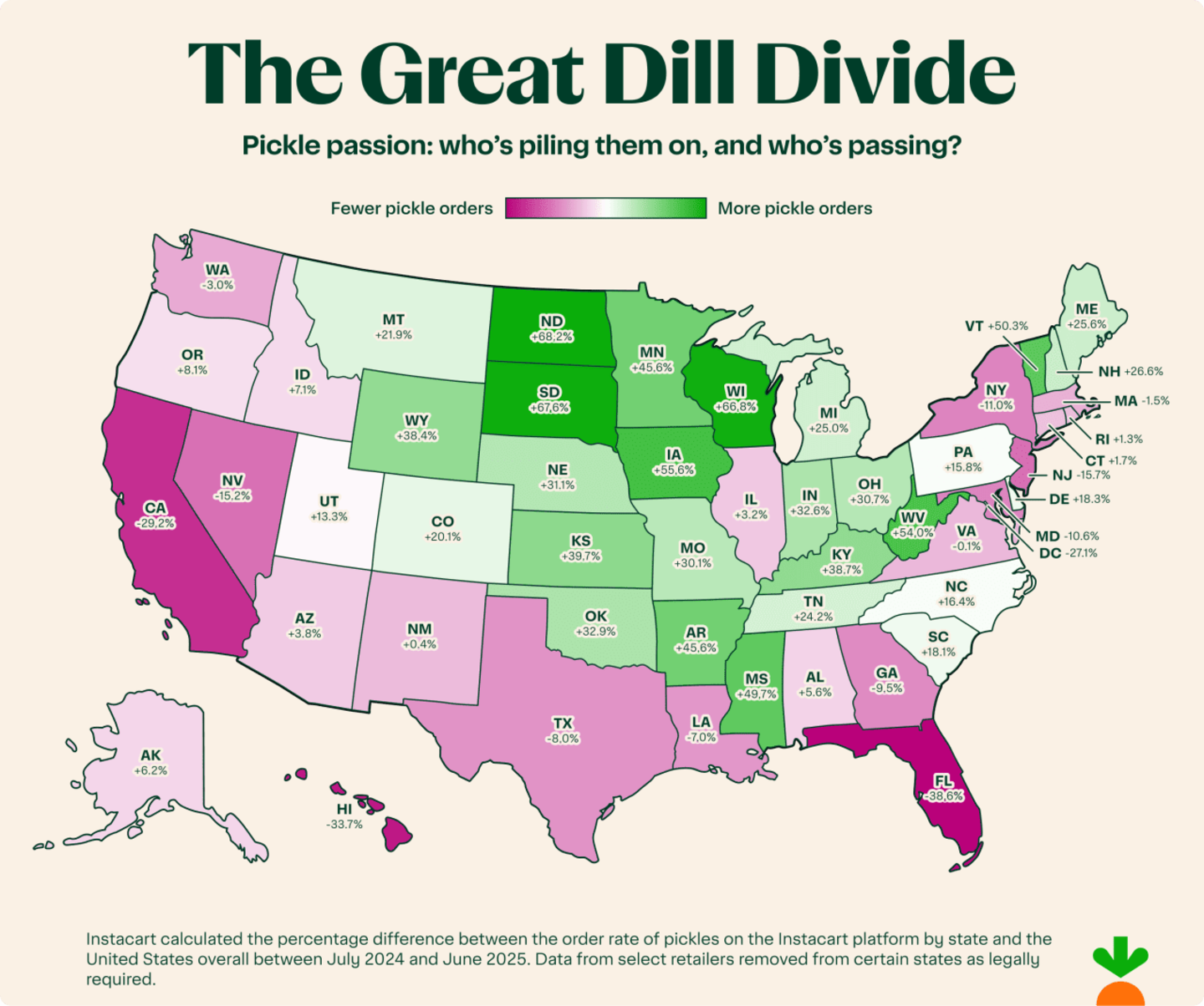 When it comes to pickle passion, the Midwest is leading the charge. According to Instacart's purchase data, North Dakota tops the list with a 68.2% higher order rate than the national average, closely followed by South Dakota (+67.6%) and Wisconsin (+66.8%). Heartland states are really all-in on the brine.