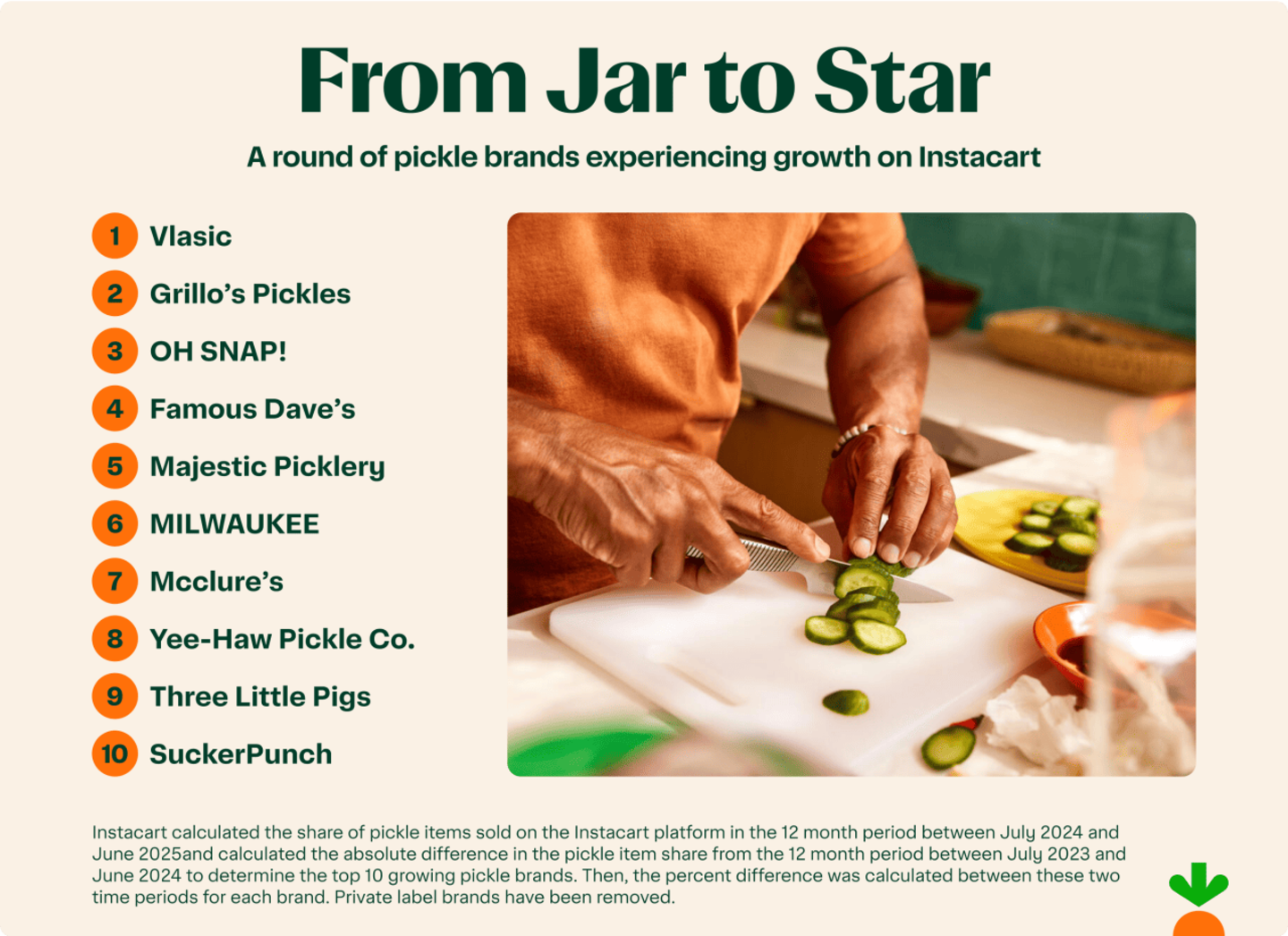Methodology: Instacart calculated the percentage difference between the share of orders on the Instacart platform that contained each category when pickles were in the same cart compared to how often each category was purchased on Instacart overall between June 2024 and July 2025.