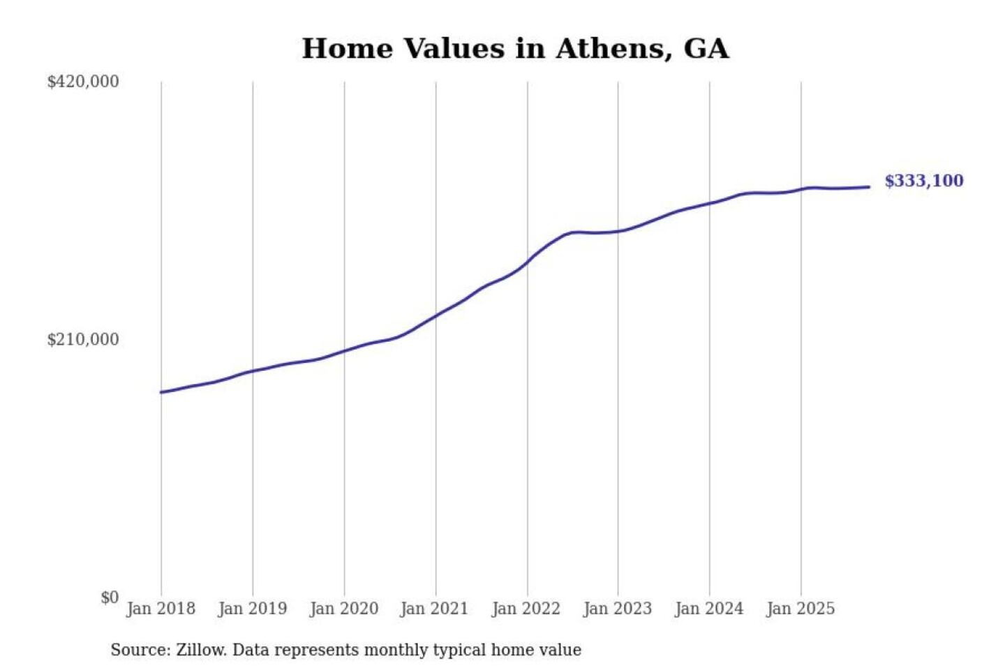 Stacker compiled a list of cities with the most expensive homes in the Athens-Clarke County, GA metro area using data from Zillow. Charts show the monthly typical home value since January 2018.
