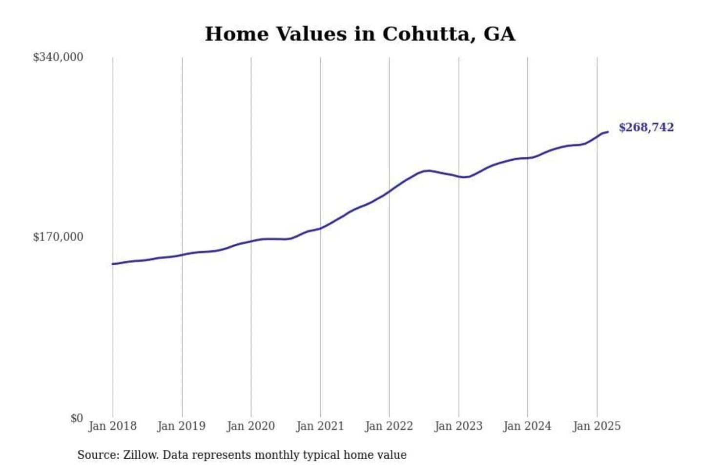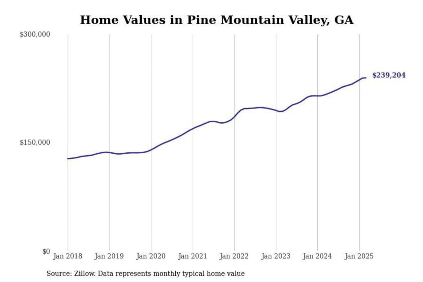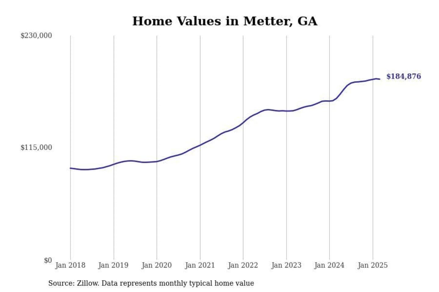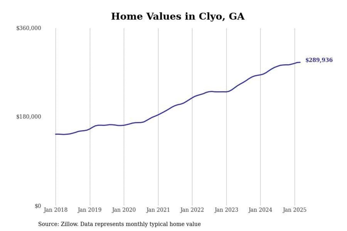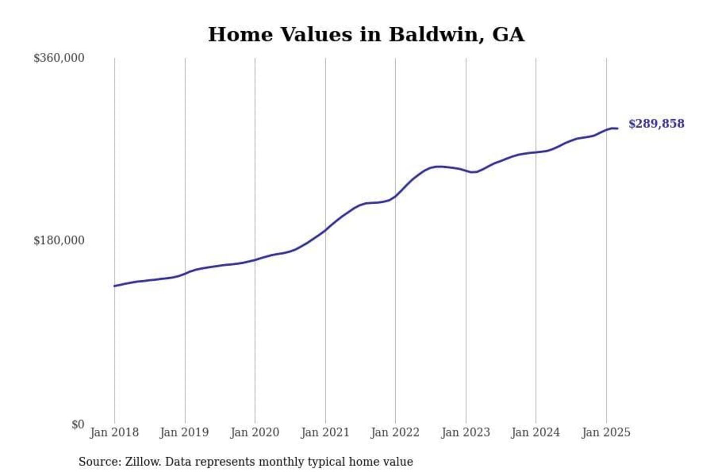 Stacker compiled a list of cities with the fastest-growing home prices in Georgia using data from Zillow. Cities are ranked by the dollar change in the Zillow Home Values Index for all homes from the 12 months ending March 2025. The charts in this story were created automatically using Matplotlib. Data was available for 50 cities and towns in Georgia.