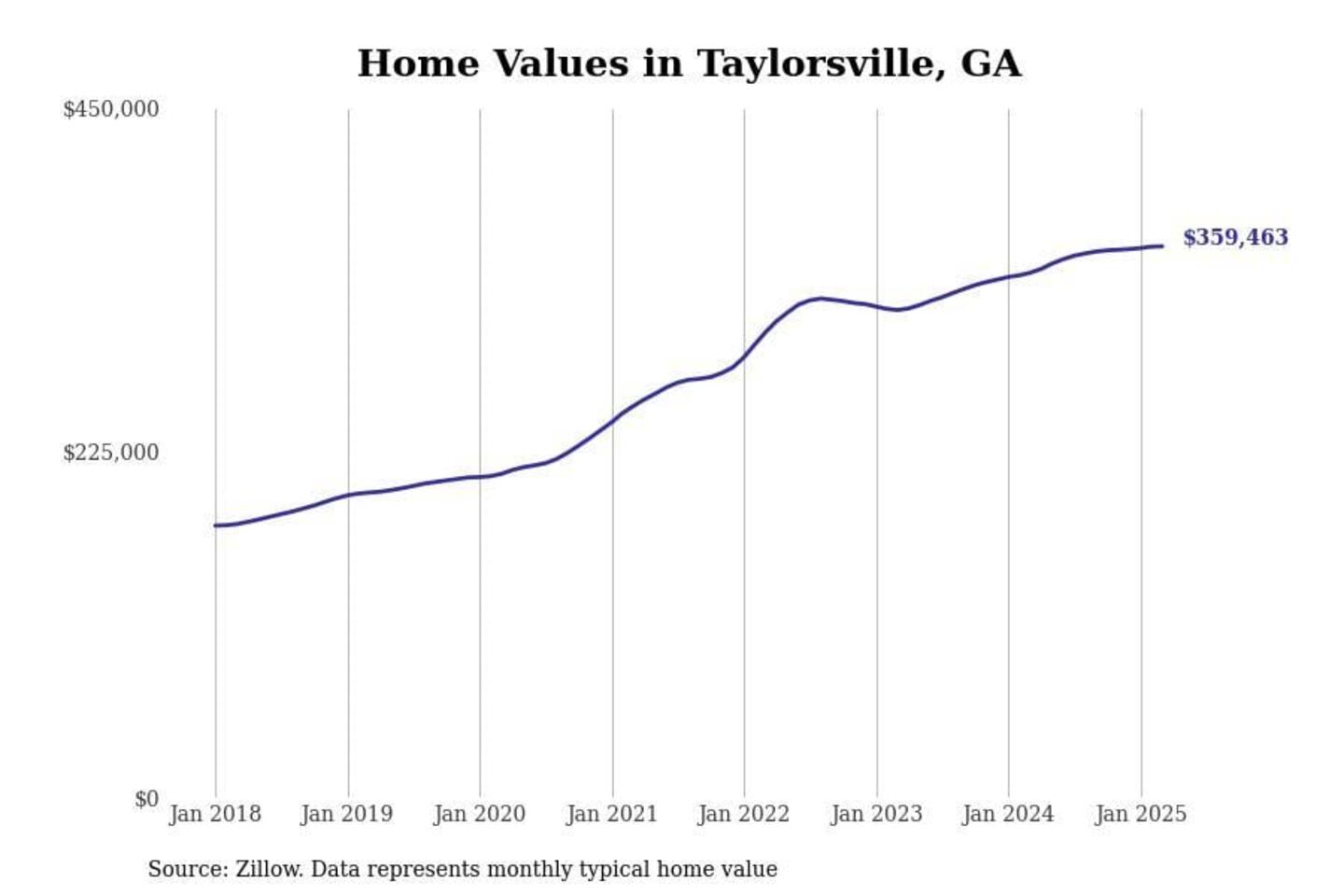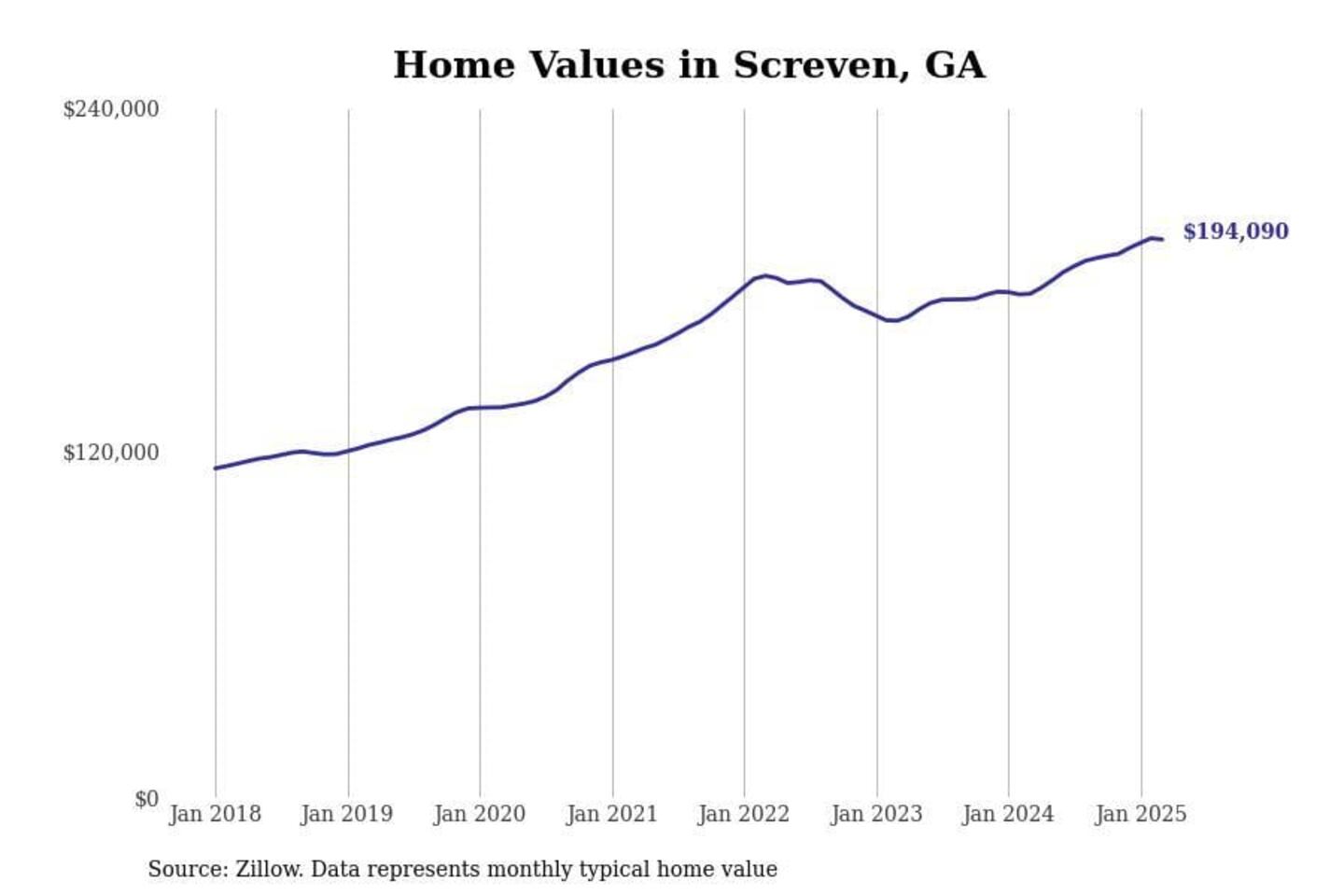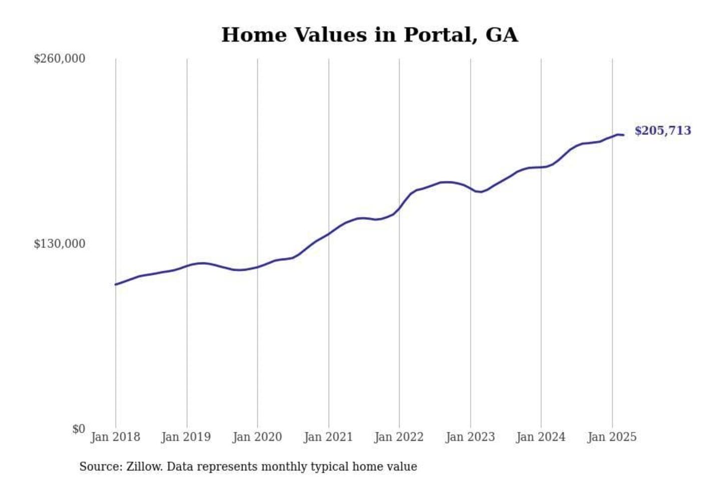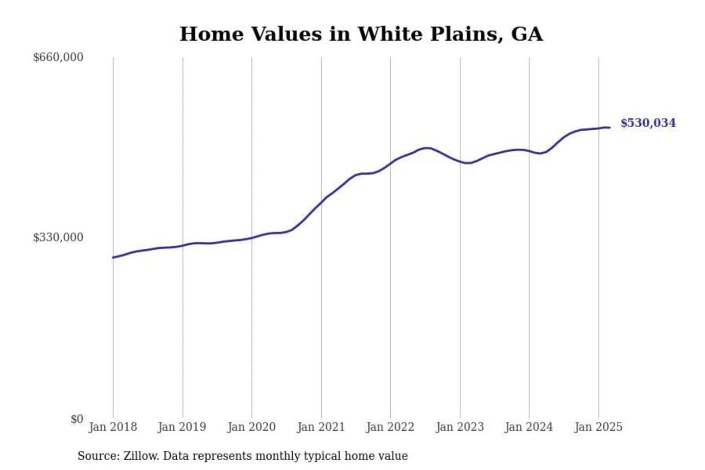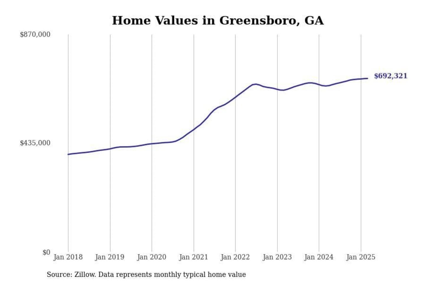 Stacker compiled a list of cities with the fastest-growing home prices in Georgia using data from Zillow. Cities are ranked by the dollar change in the Zillow Home Values Index for all homes from the 12 months ending March 2025. The charts in this story were created automatically using Matplotlib. Data was available for 50 cities and towns in Georgia.
