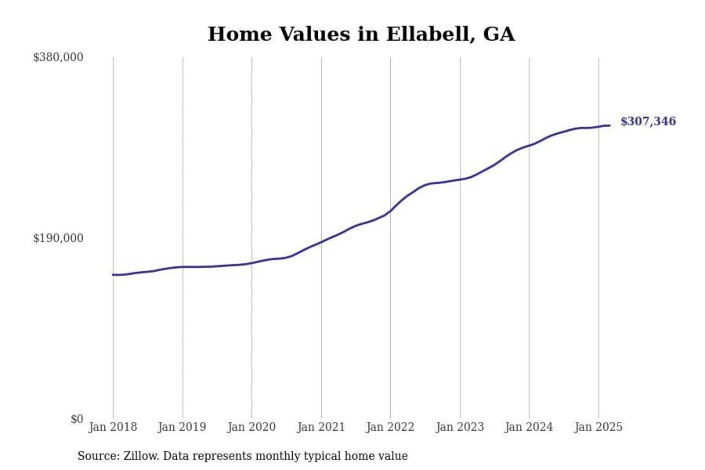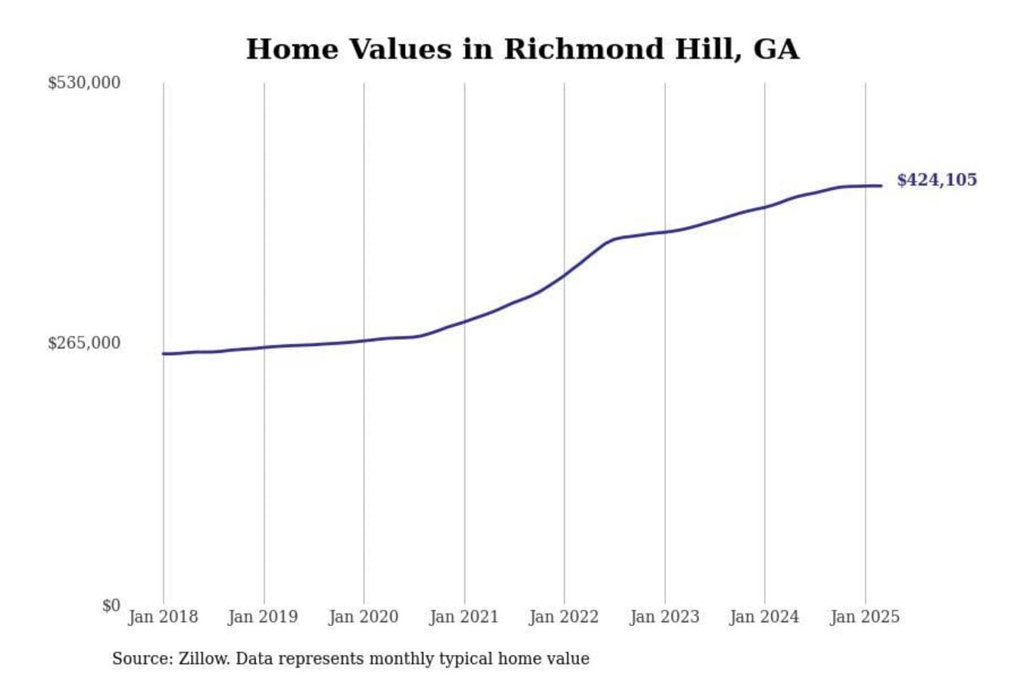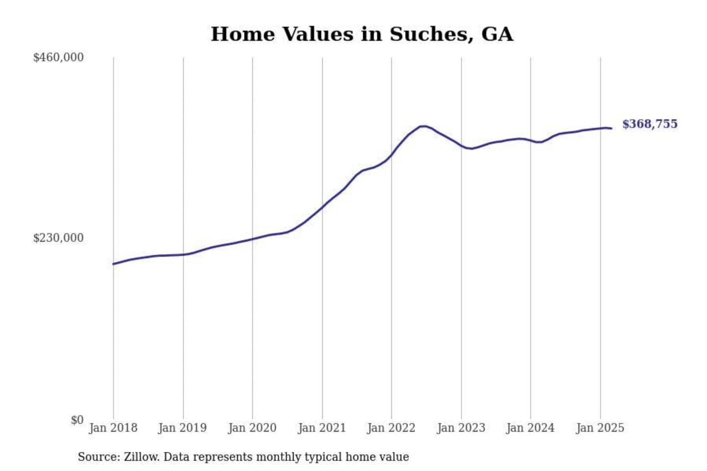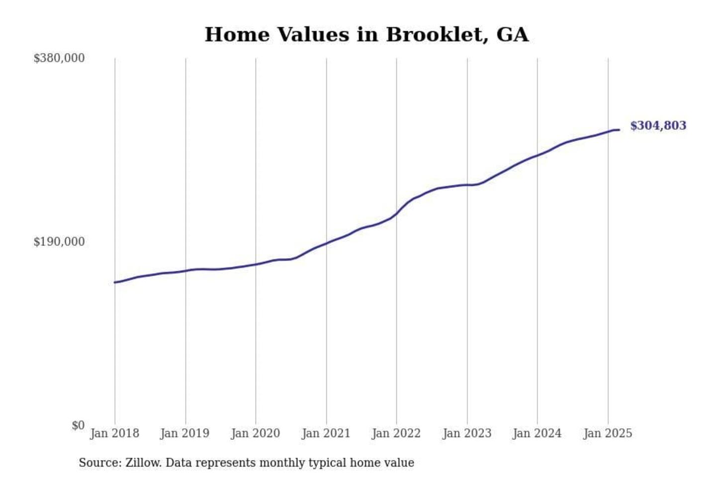 Stacker compiled a list of cities with the fastest-growing home prices in Georgia using data from Zillow. Cities are ranked by the dollar change in the Zillow Home Values Index for all homes from the 12 months ending March 2025. The charts in this story were created automatically using Matplotlib. Data was available for 50 cities and towns in Georgia.