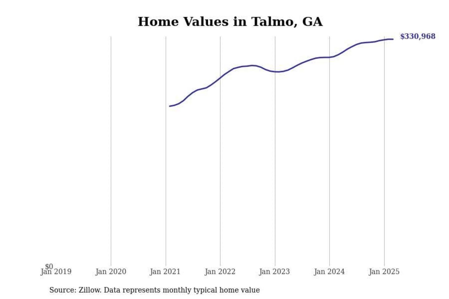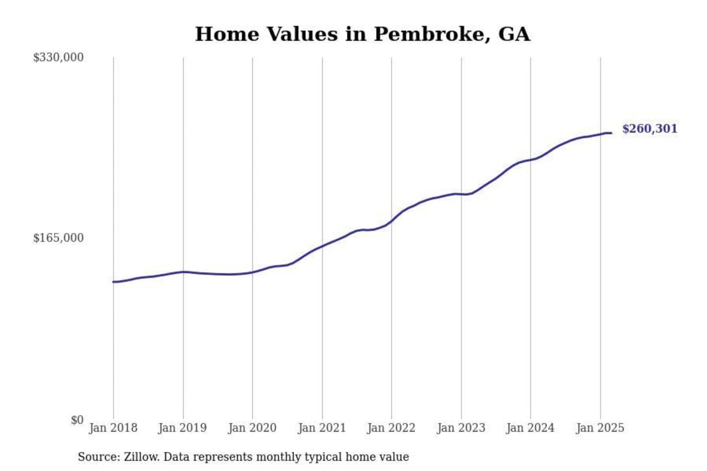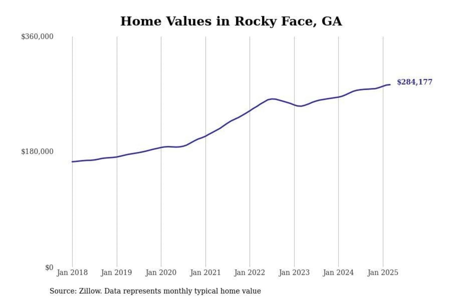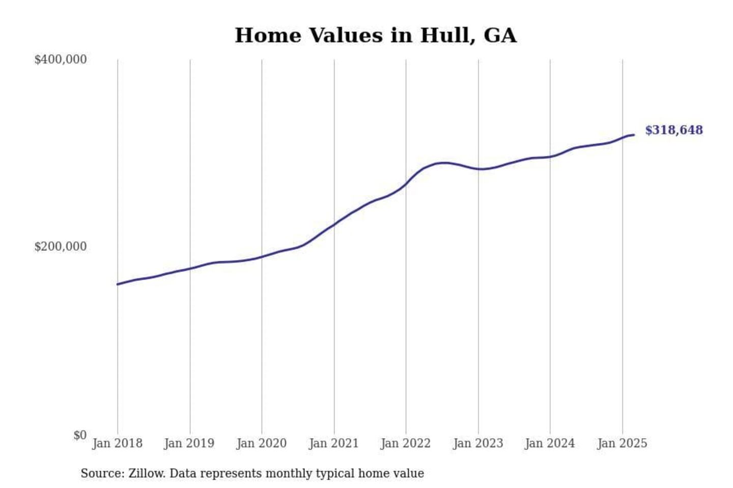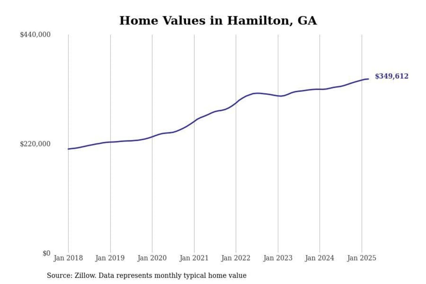 Stacker compiled a list of cities with the fastest-growing home prices in Georgia using data from Zillow. Cities are ranked by the dollar change in the Zillow Home Values Index for all homes from the 12 months ending March 2025. The charts in this story were created automatically using Matplotlib. Data was available for 50 cities and towns in Georgia.