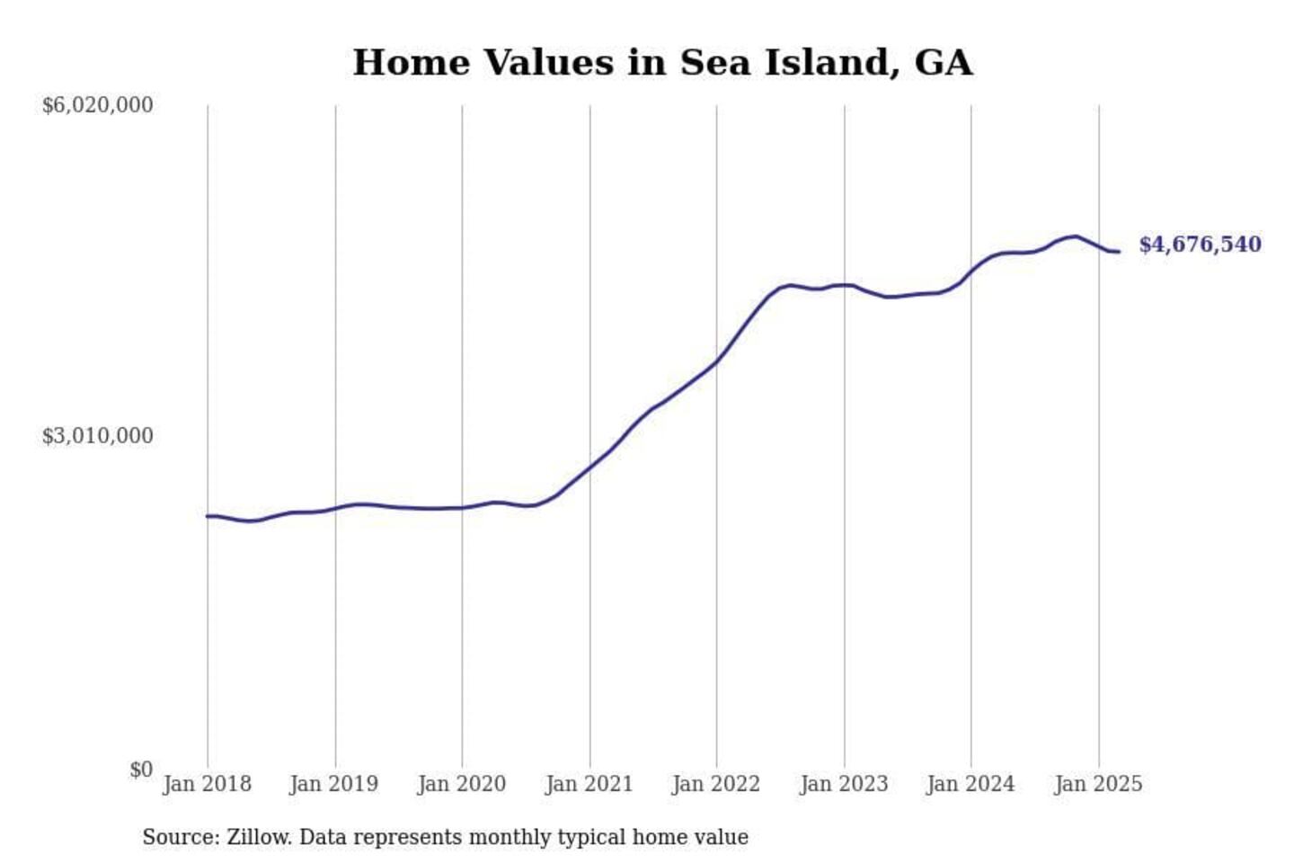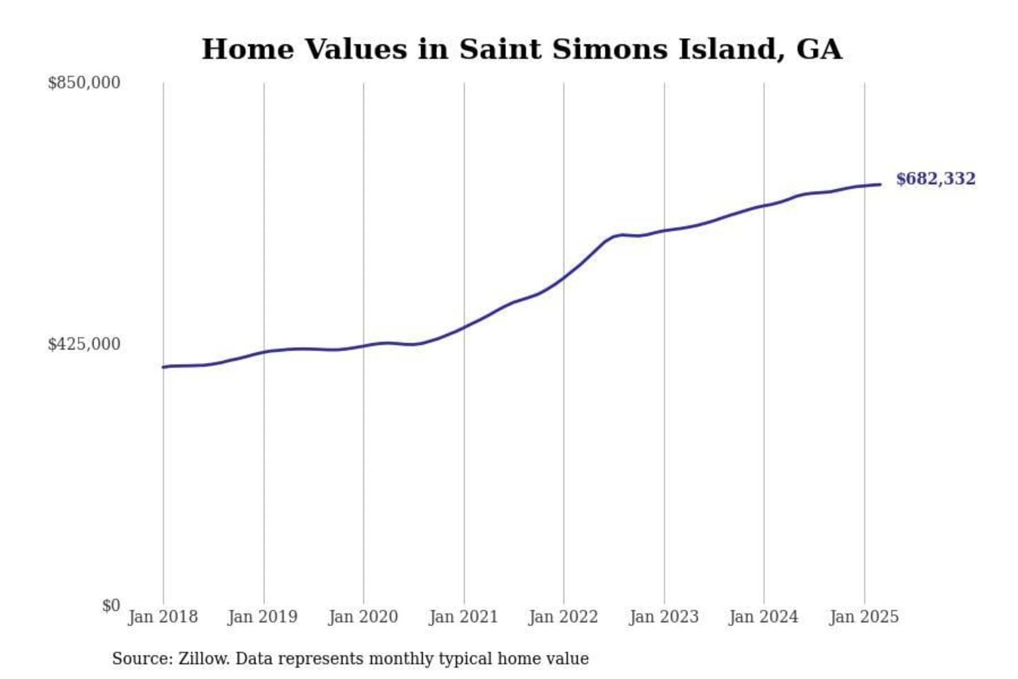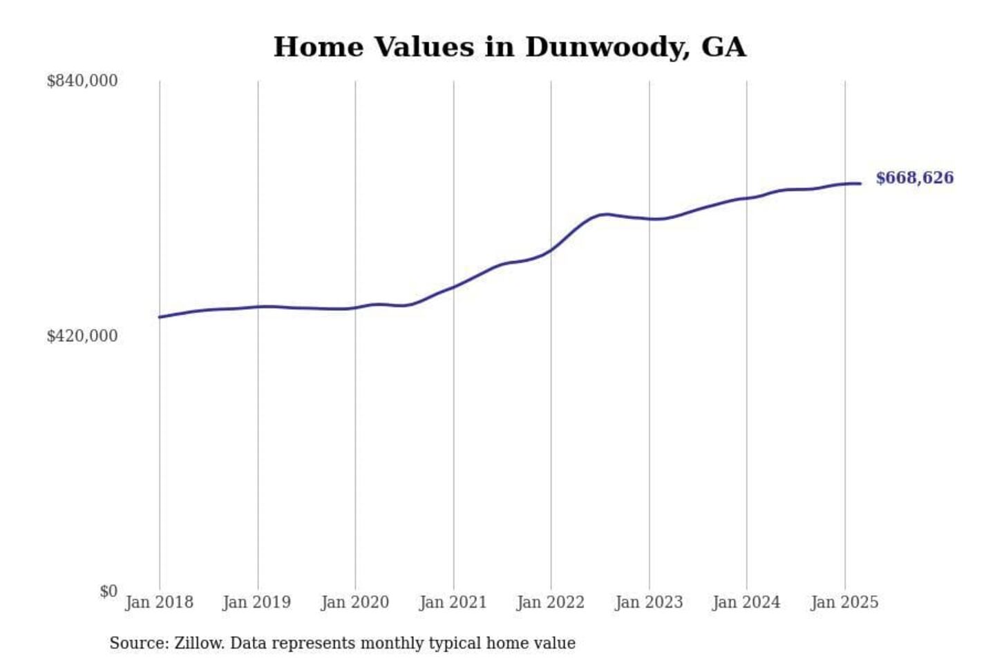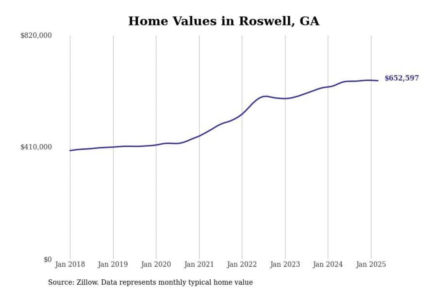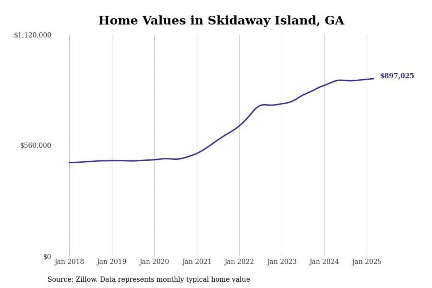 Stacker compiled a list of cities with the fastest-growing home prices in Georgia using data from Zillow. Cities are ranked by the dollar change in the Zillow Home Values Index for all homes from the 12 months ending March 2025. The charts in this story were created automatically using Matplotlib. Data was available for 50 cities and towns in Georgia.