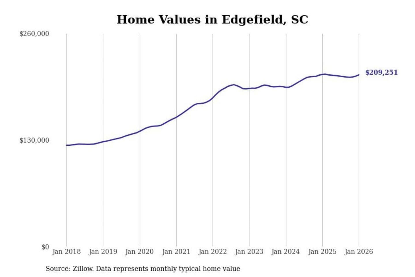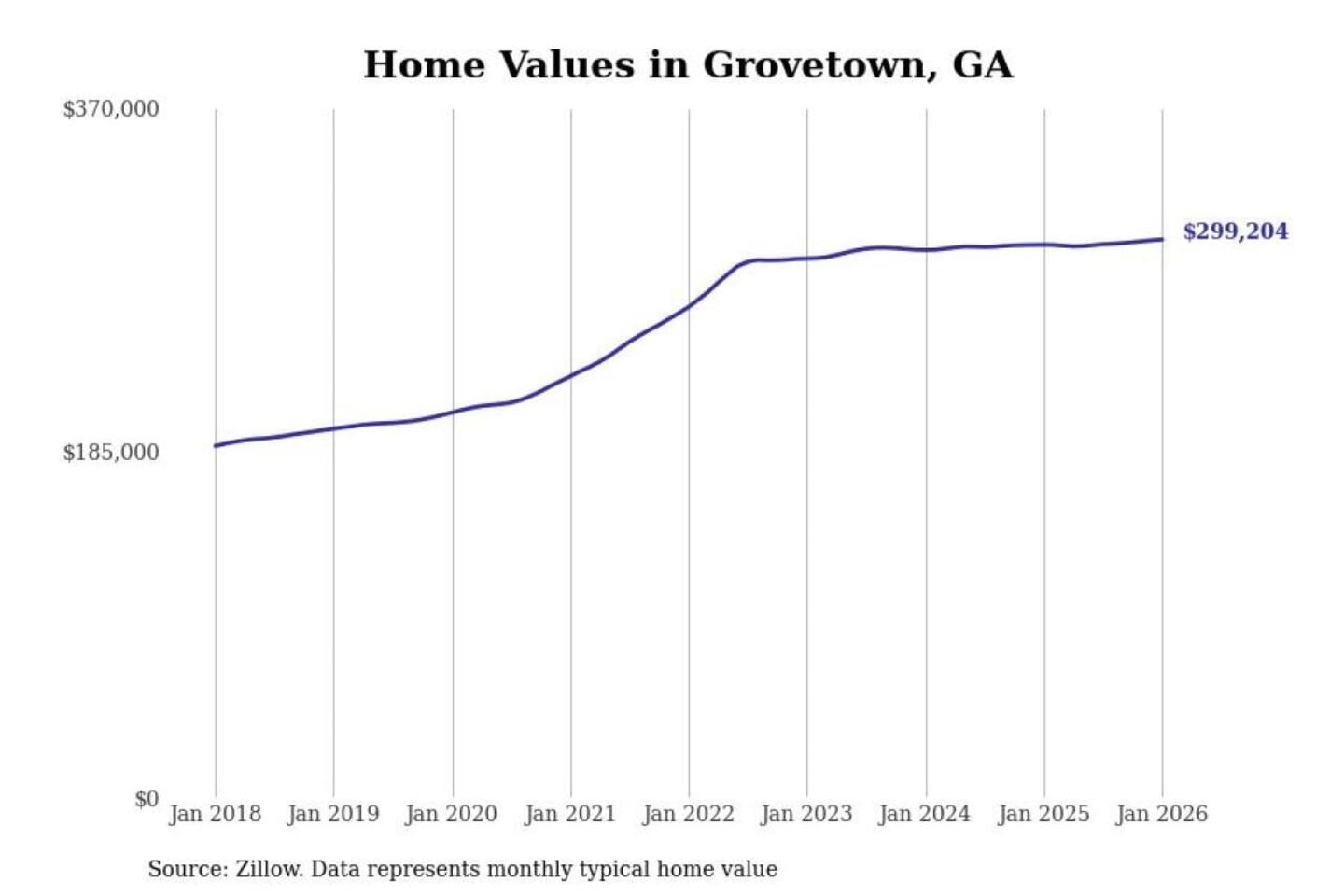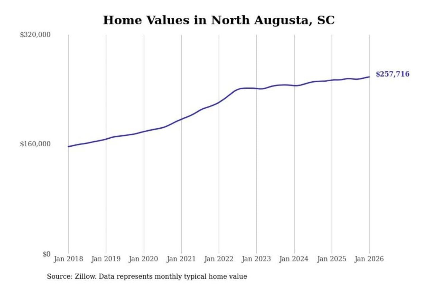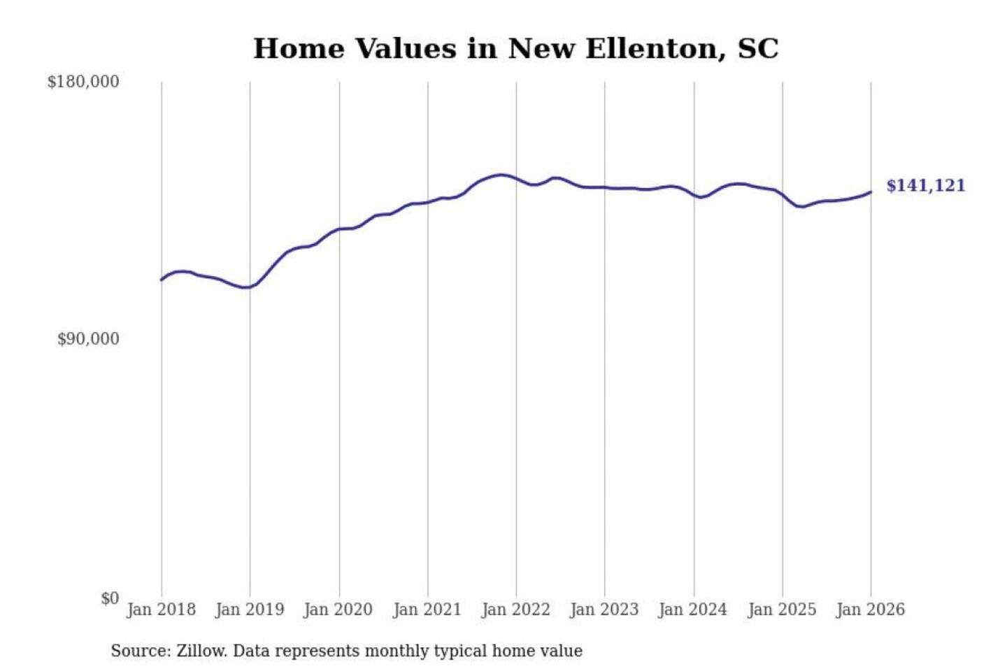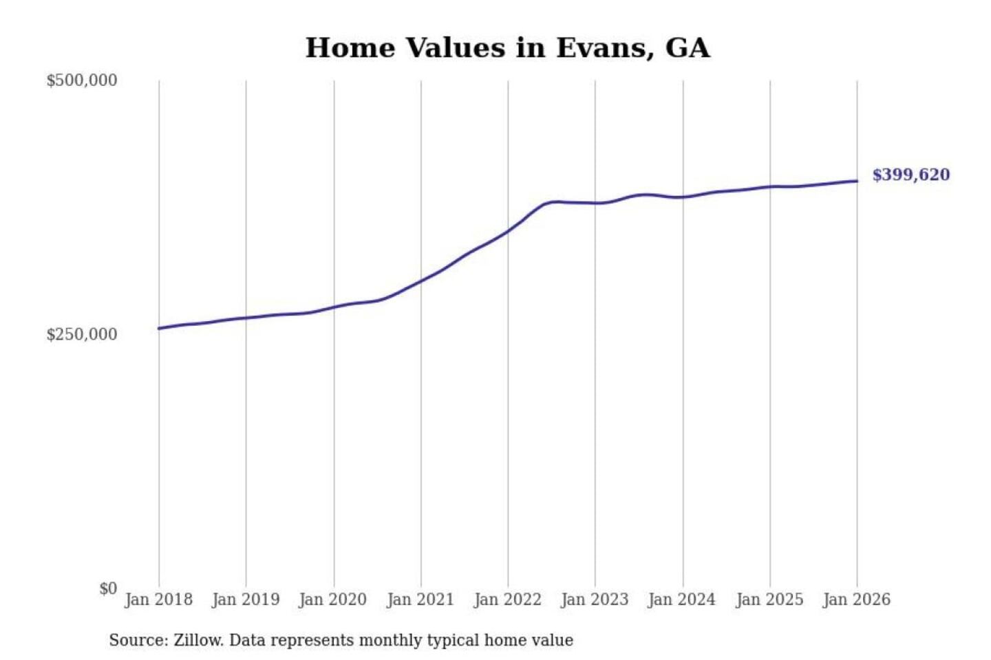 Stacker compiled a list of cities with the most expensive homes in the Augusta-Richmond County, GA-SC metro area using data from Zillow. Charts show the monthly typical home value since January 2018.