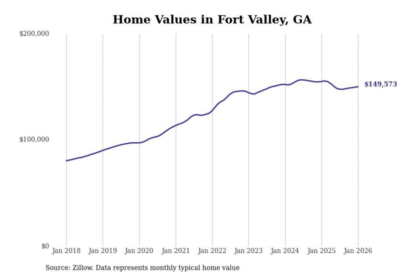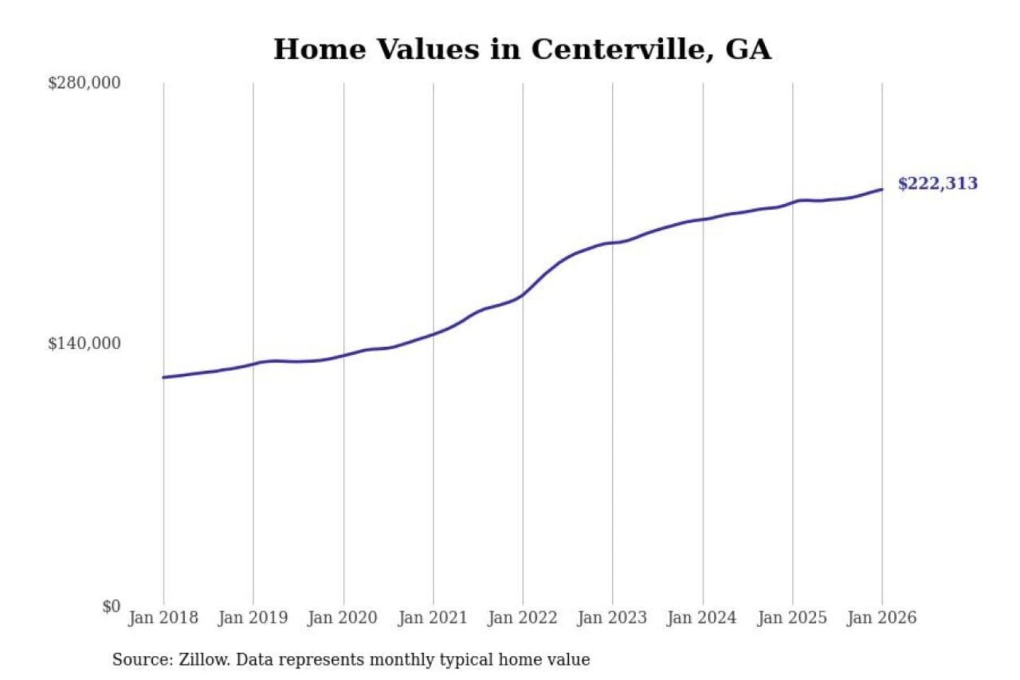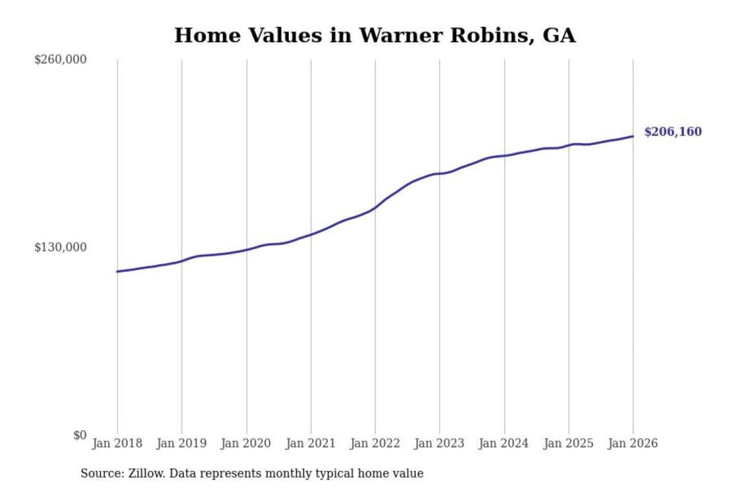 Stacker compiled a list of cities with the most expensive homes in the Warner Robins, GA metro area using data from Zillow. Charts show the monthly typical home value since January 2018.