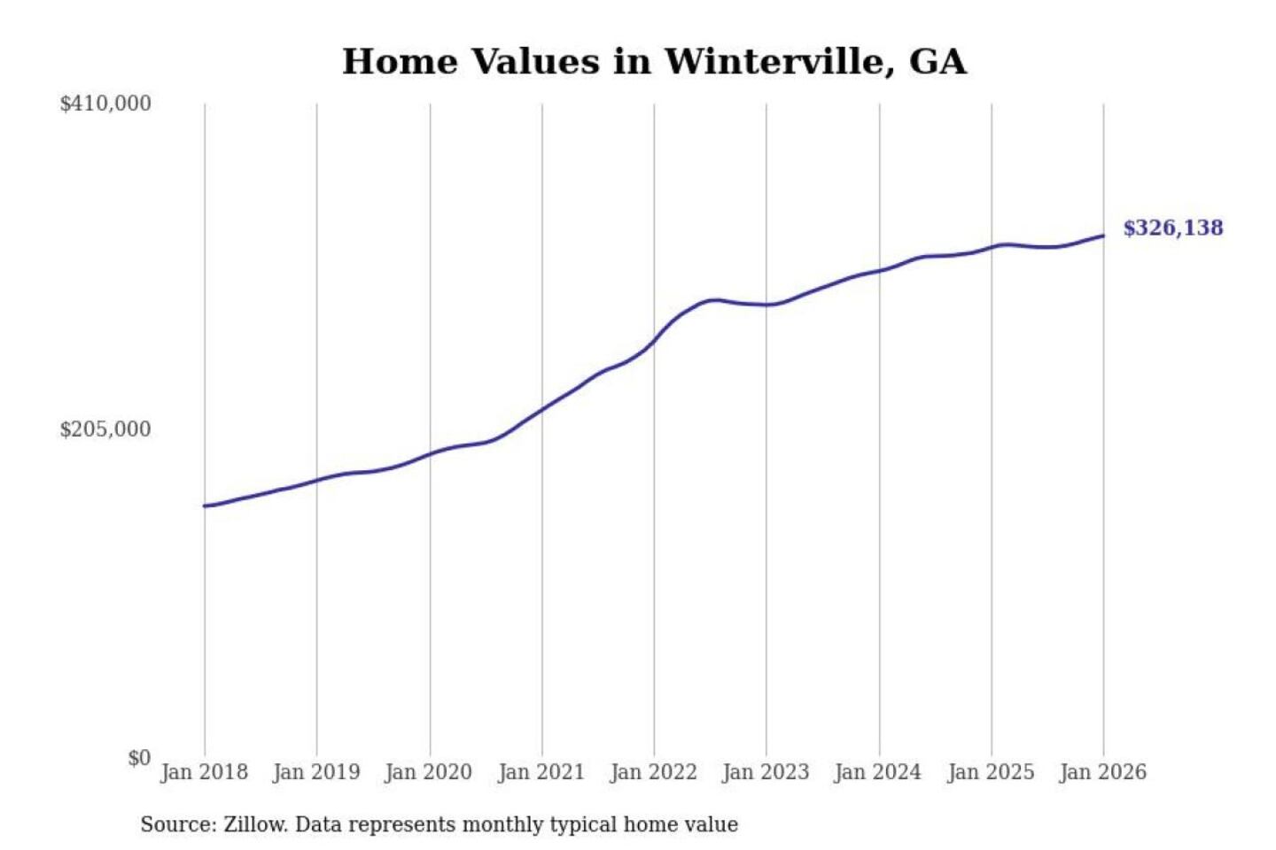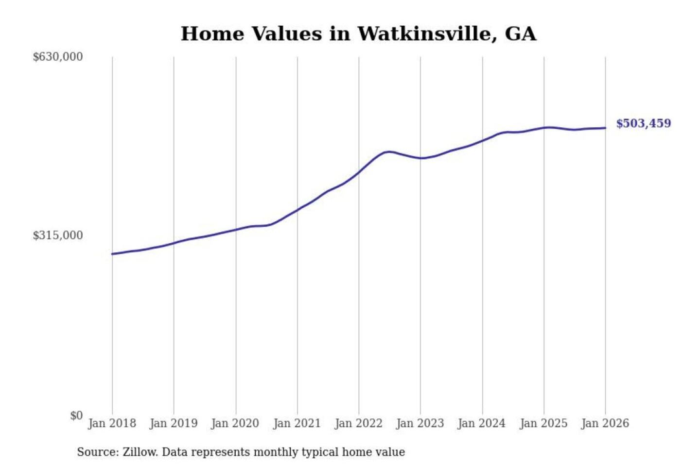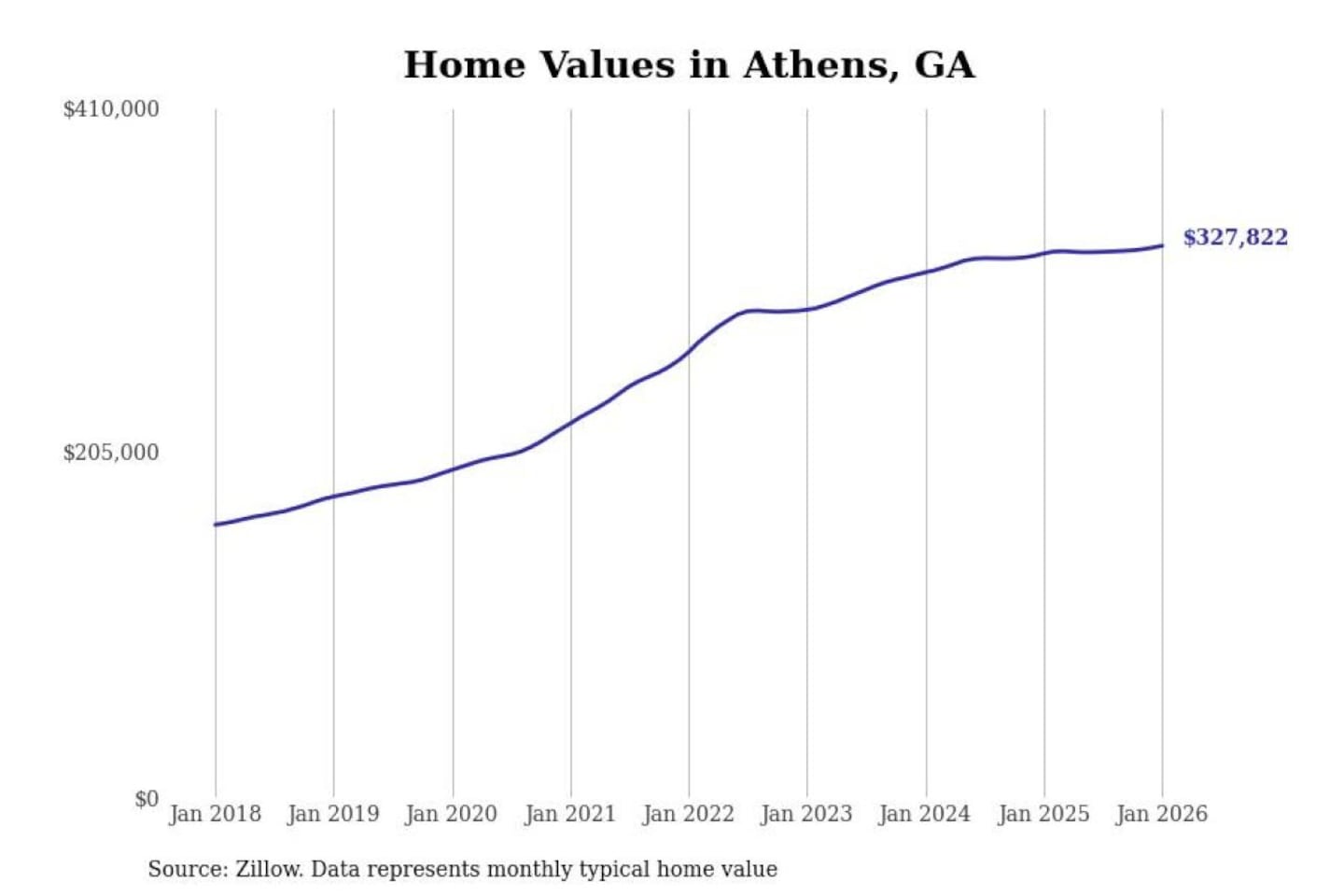 Stacker compiled a list of cities with the most expensive homes in the Athens-Clarke County, GA metro area using data from Zillow. Charts show the monthly typical home value since January 2018.