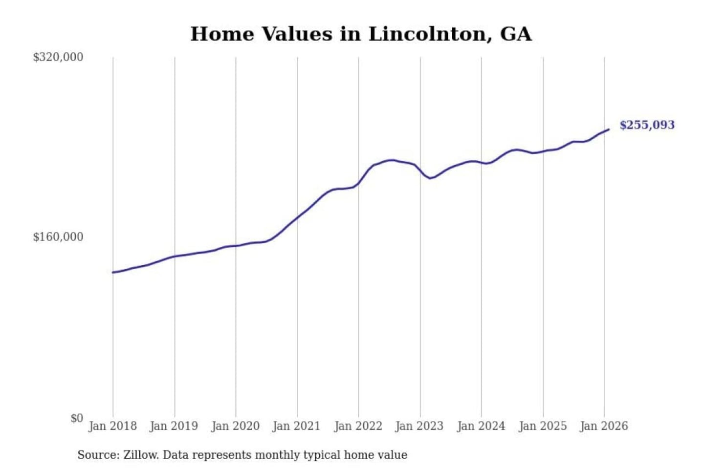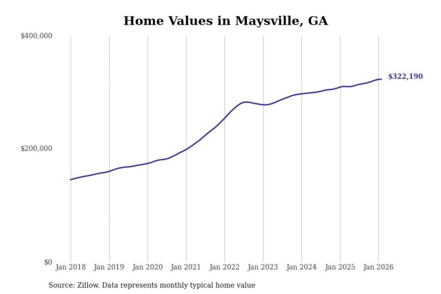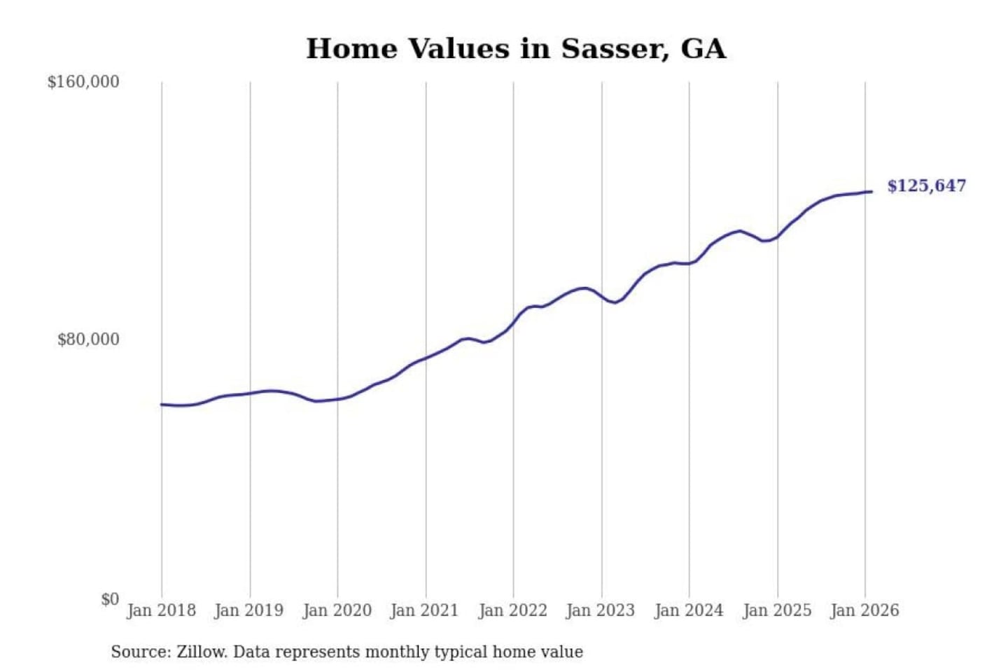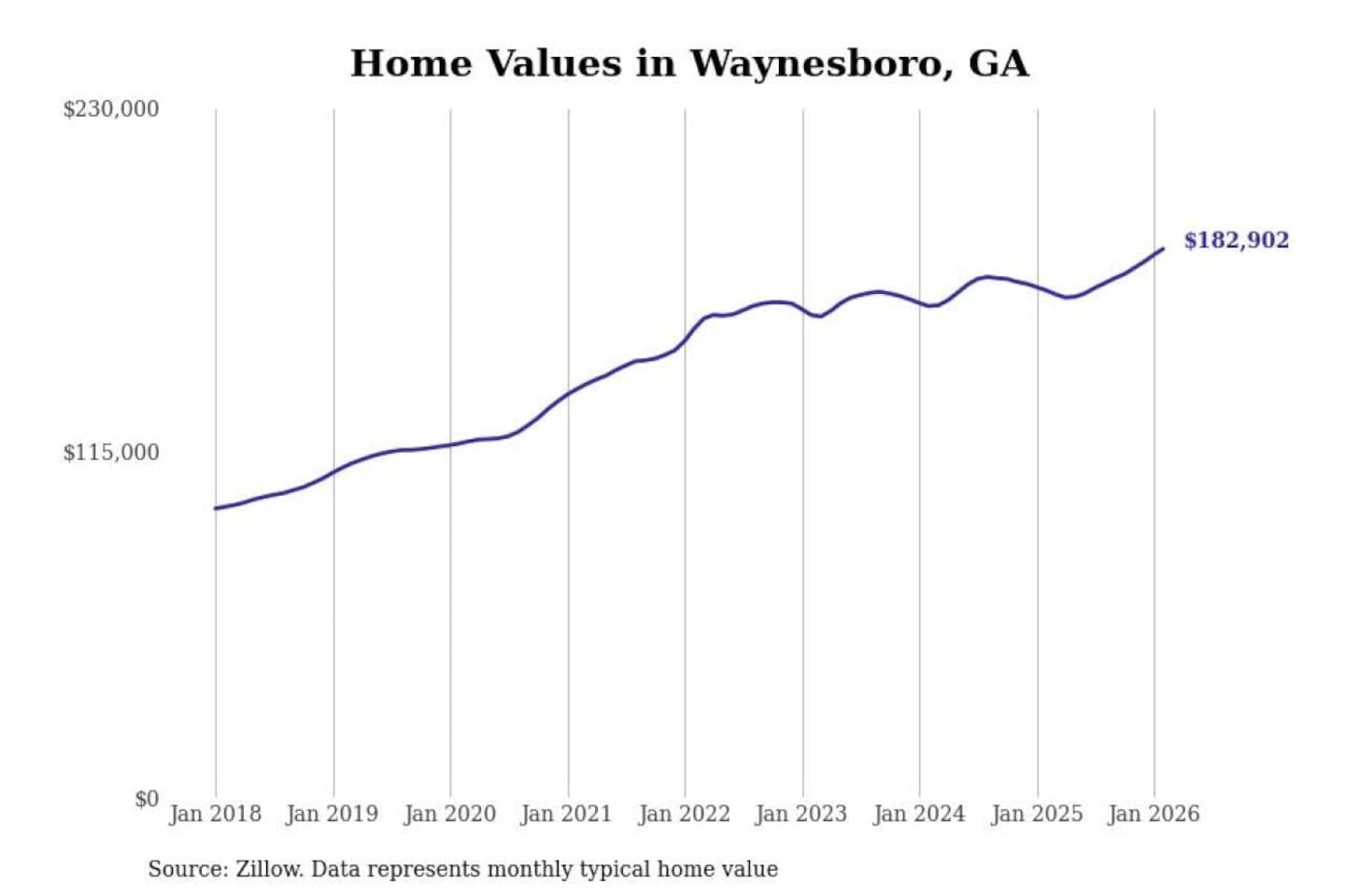 Stacker compiled a list of cities with the fastest-growing home prices in Georgia using data from Zillow. Cities are ranked by the dollar change in the Zillow Home Values Index for all homes from the 12 months ending February 2026. The charts in this story were created automatically using Matplotlib. Data was available for 50 cities and towns in Georgia.
