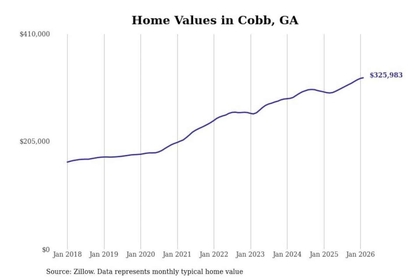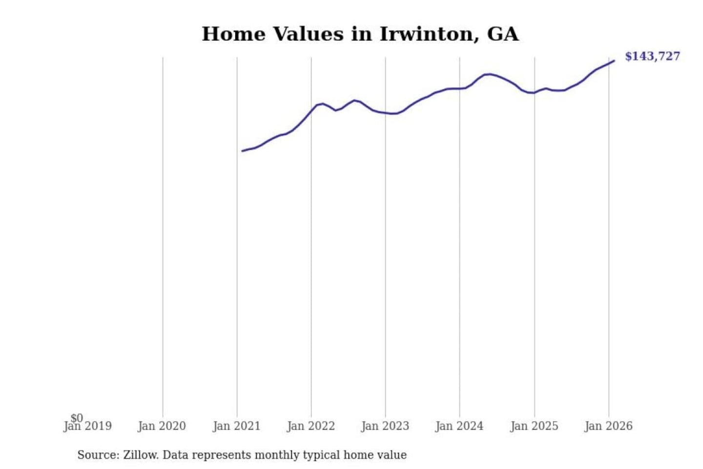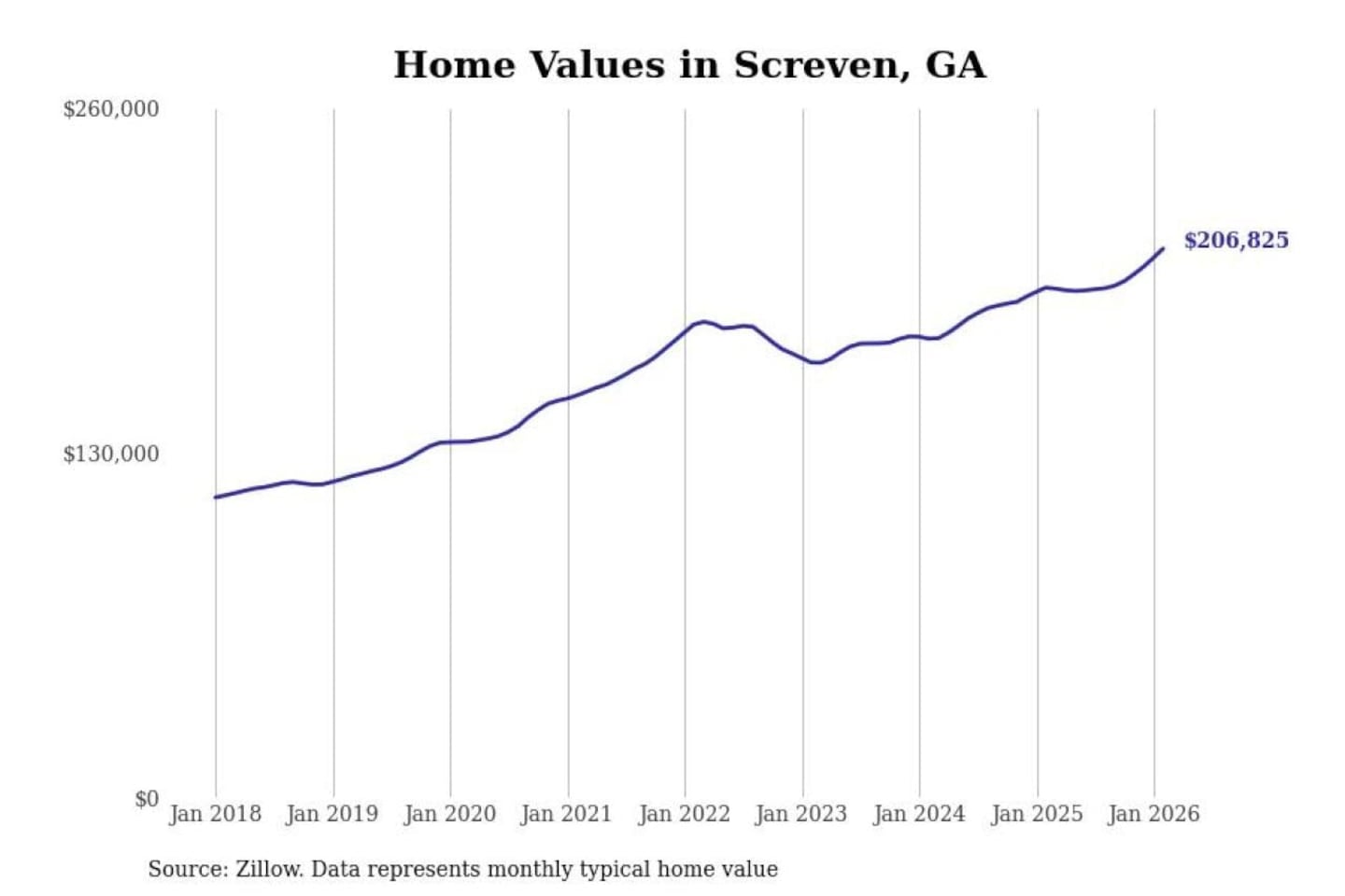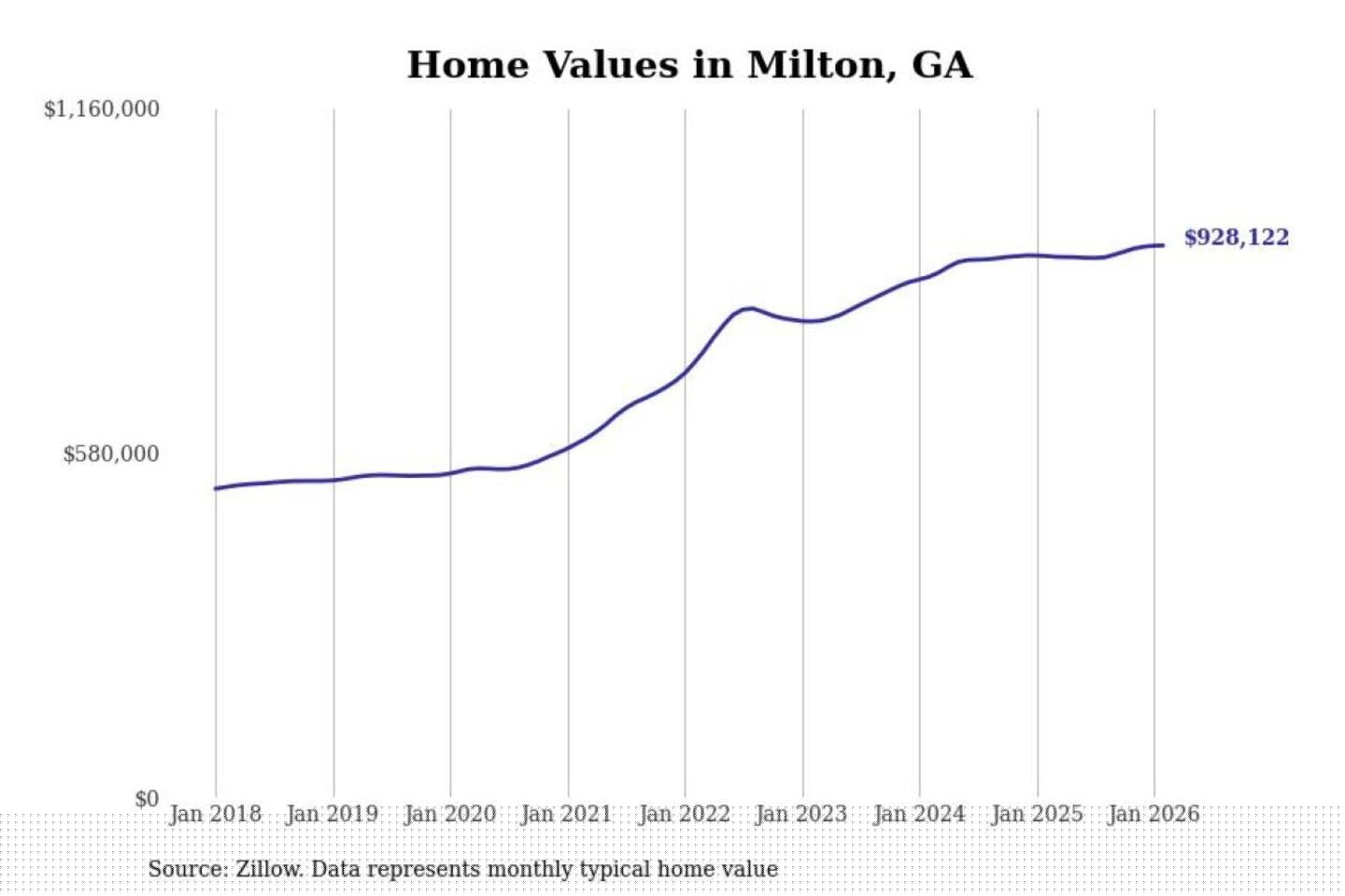 Stacker compiled a list of cities with the fastest-growing home prices in Georgia using data from Zillow. Cities are ranked by the dollar change in the Zillow Home Values Index for all homes from the 12 months ending February 2026. The charts in this story were created automatically using Matplotlib. Data was available for 50 cities and towns in Georgia.
