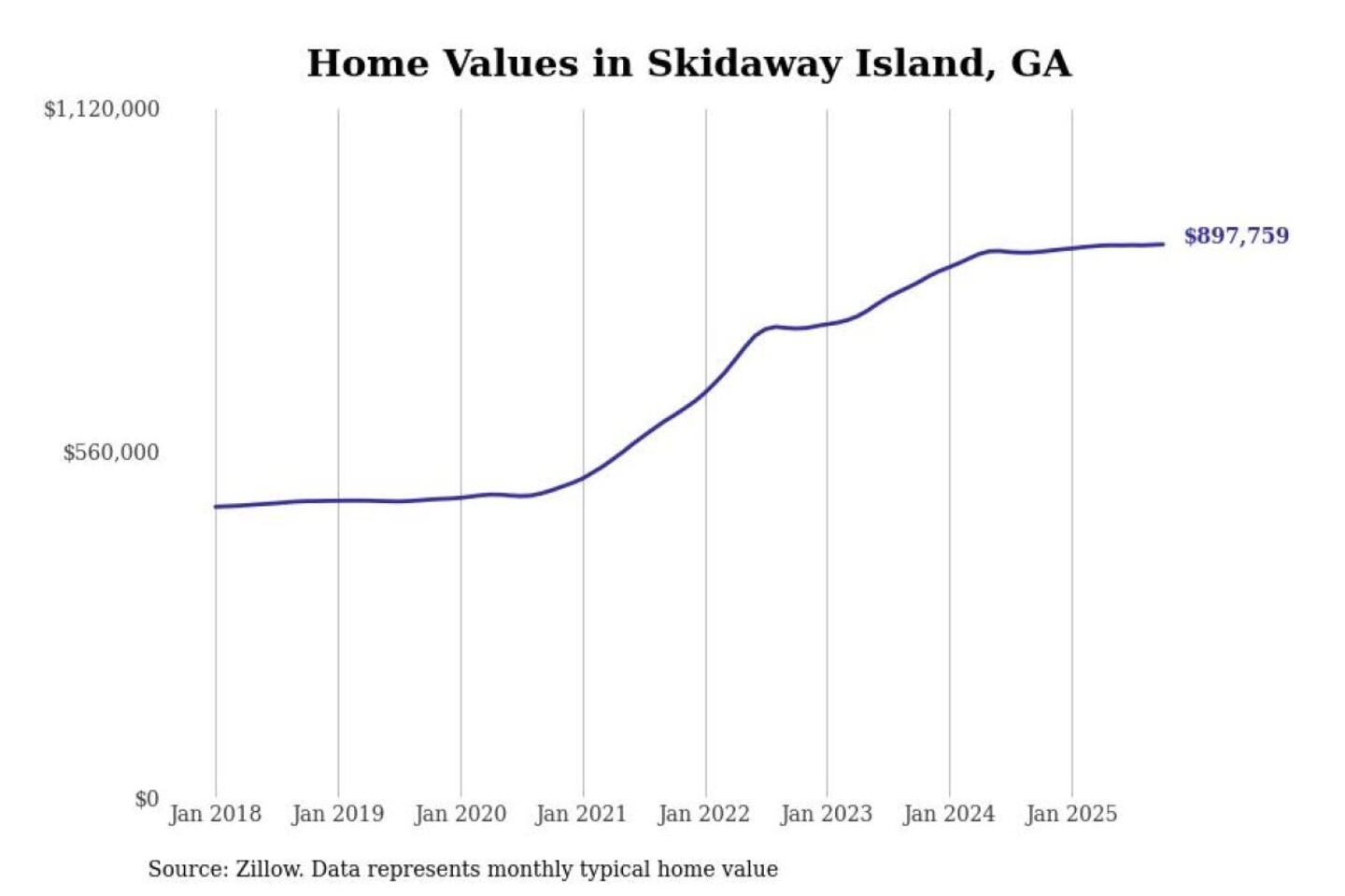 Stacker compiled a list of cities with the most expensive homes in Georgia using data from Zillow. Cities are ranked by the Zillow Home Values Index for all homes as of October 2025. The charts in this story were created automatically using Matplotlib.