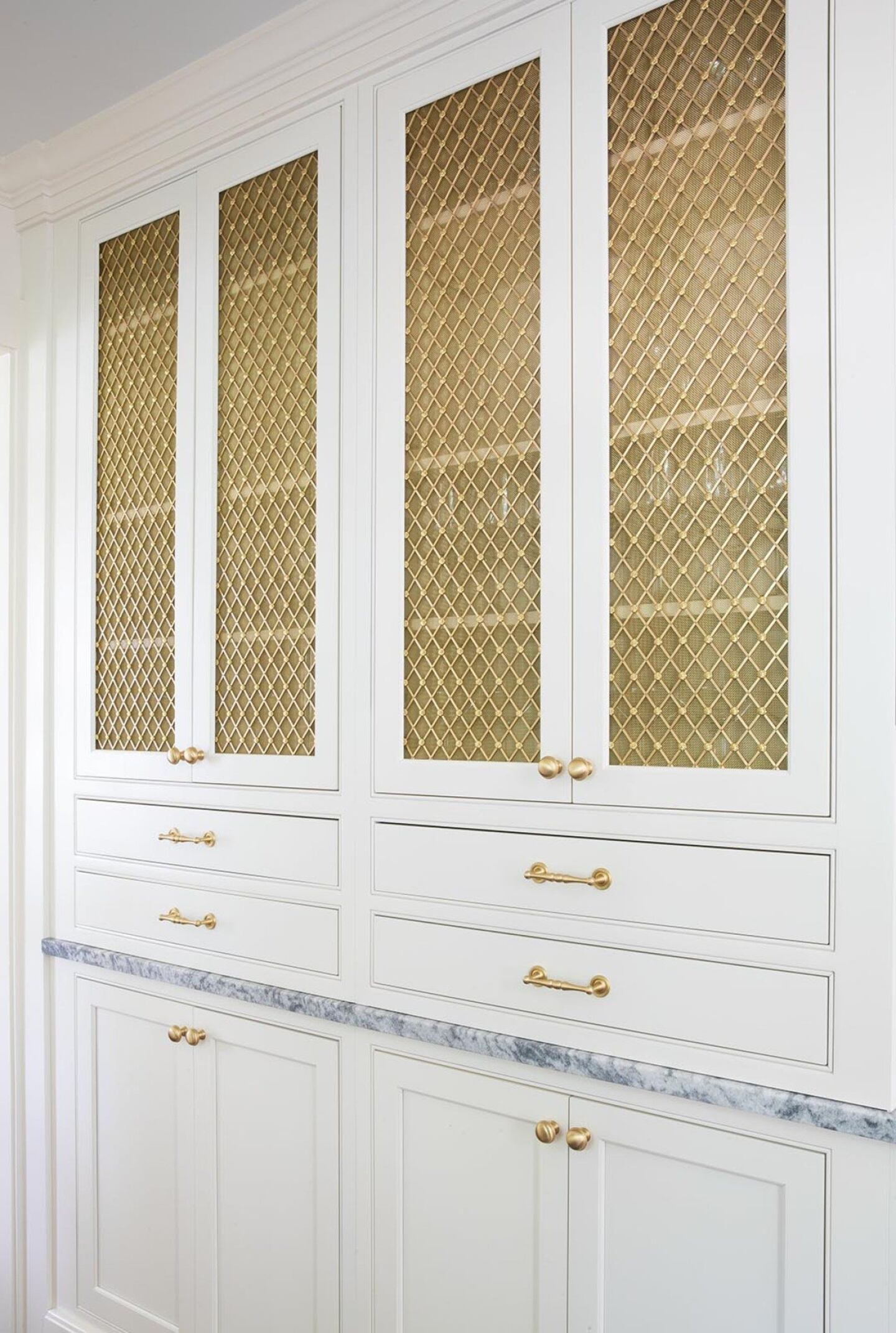 This was the playful name Smith gave to the cabinet that holds a mixer, toaster, and other essential appliances. Both interior and exterior wood finish fits in the design, whether the cabinet doors are open or not. Through the cabinet window, beautiful glassware accentuates the design from within. "The brass grilles from Armac Martin are one of my favorite details in the kitchen," Smith said.