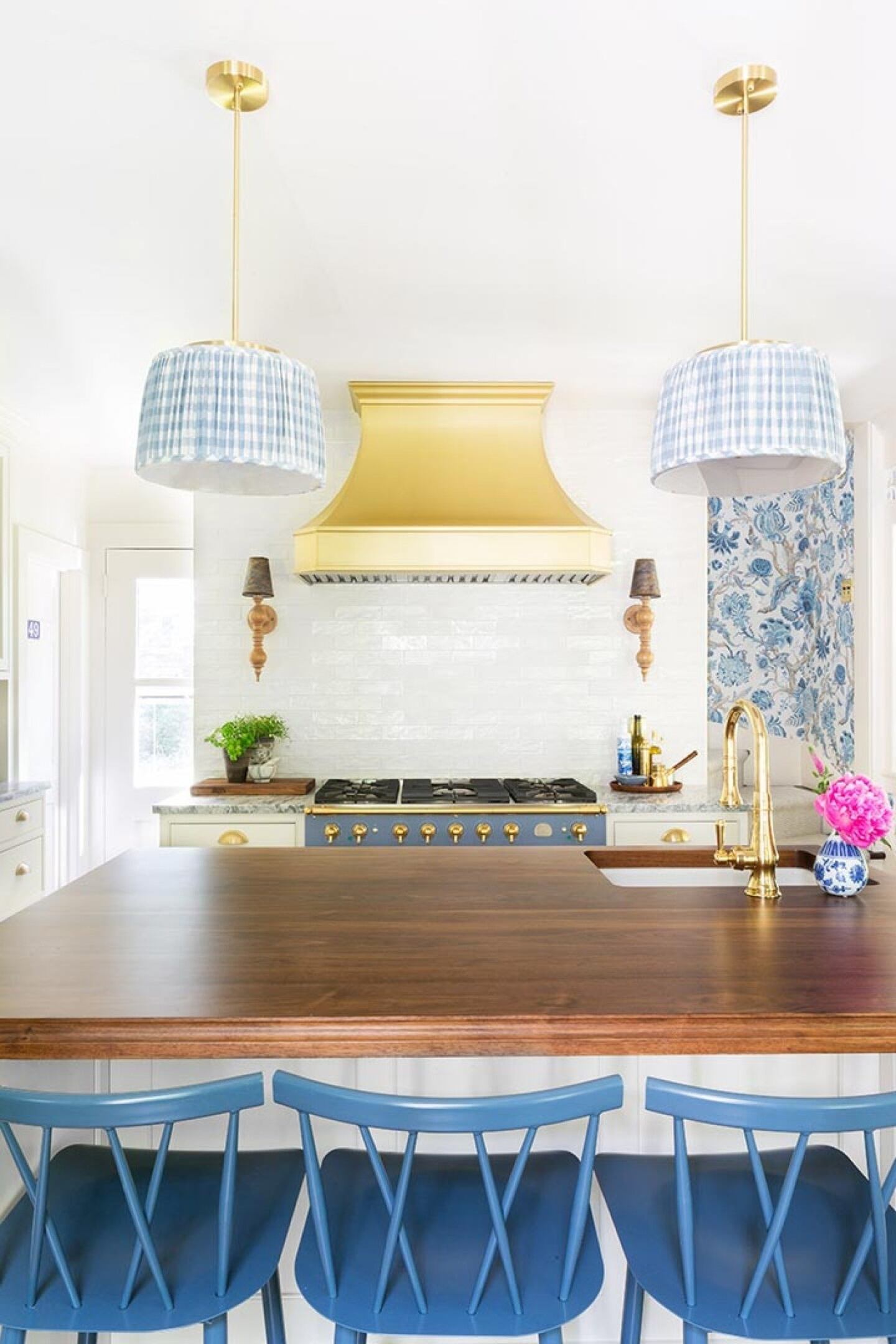 As the centerpiece of the kitchen, the range hood was the pinnacle of attention in the entire project. Smith was striving for something that collided with the sophistication of the appliances. "I wanted something as elevated as the range, but that didn't compete," she said. Due in part to the golden brass finish of the hood and the light color palette, the elevated design draws immediate attention.