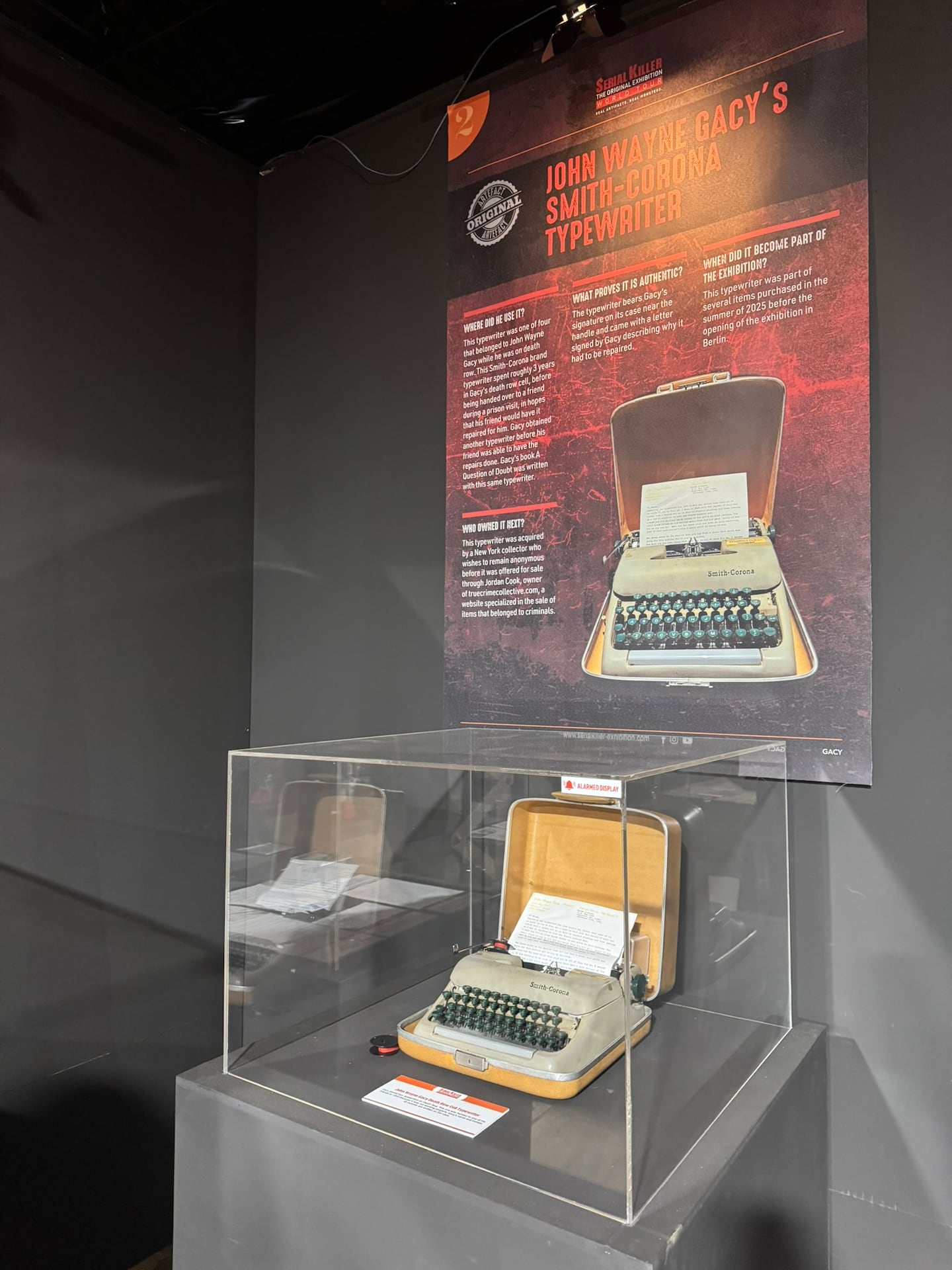 The exhibition features over 2,100 original artifacts throughout the 27,000 square foot immersive experience. Artifacts include Ted Bundy’s dental mold, Jeffrey Dahmer’s glasses, John Wayne Gacy’s typewriter, a guitar owned by Charles Manson, and Armin Meiwes’ freezer.
