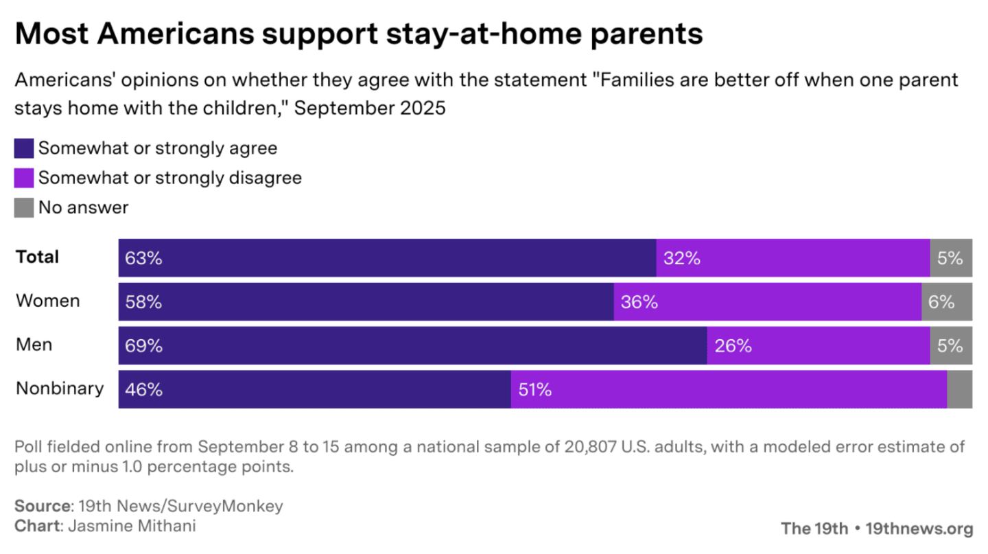 "Both parents should participate in raising children, but I'm thinking more that the man is typically the breadwinner and the female is more focused on the home and raising children," Jennings told The 19th. "I know it sounds old-fashioned."