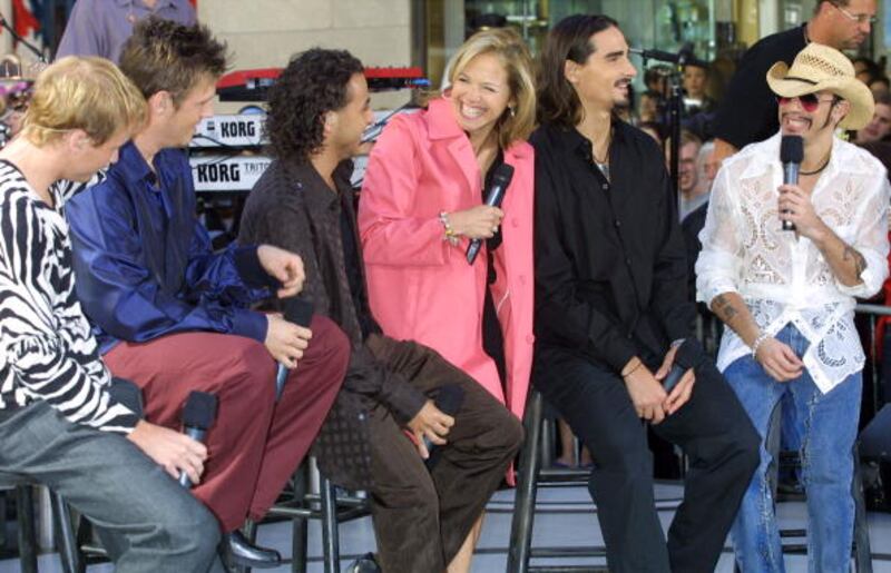 Through the years 391358 26: Television host Katie Couric talks with the boy band Backstreet Boys July 2, 2001 on the Today Show at Rockefeller Plaza in New York City. From left to right are Brian Littrell, Nick Carter, Howie Dorough, Couric, Kevin Richardson and A.J. McLean. (Photo by George De Sota/Getty Images) (George De Sota/Getty Images)