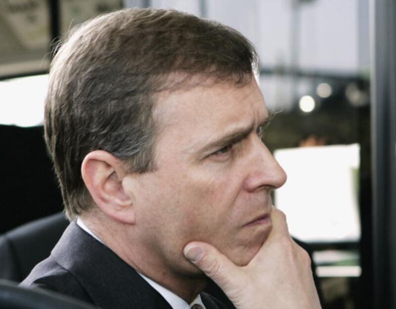 Through the years HRH Prince Andrew, Duke of York, reacts at the presentation of a hydrogen gas station after he arrived at the airport on April 5, 2005 in Munich, Germany. Prince Andrew arrived for a one day visit of Germany. (Photo by Jan Pitman/Getty Images) (Jan Pitman/Getty Images)