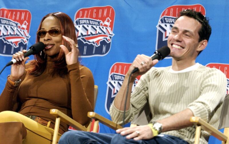 Through the years Mary J. Blige and Marc Anthony during Super Bowl XXXVI - Pre-Show Press Conference at The Superdome in New Orleans, Louisiana. (Photo by Theo Wargo/WireImage) (Theo Wargo/WireImage)