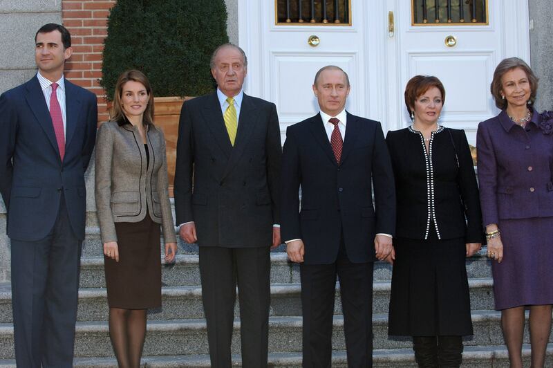 Photos: Vladimir Putin, Russia's President MADRID, SPAIN - FEBRUARY 08: Russian President Vladimir Putin (3rd R) and his wife Ludmila Putin (2nd R) are received by Spanish Royals for a gala lunch at Zarzuela Palace on February 8, 2006 in Madrid, Spain.From (L to R) are: Crown Prince Felipe of Spain, Princess Letizia of Spain, King Juan Carlos of Spain, Putin, Ludmila Putin and Queen Sofia of Spain. (Photo by Carlos Alvarez/Getty Images) (Carlos Alvarez/Getty Images)