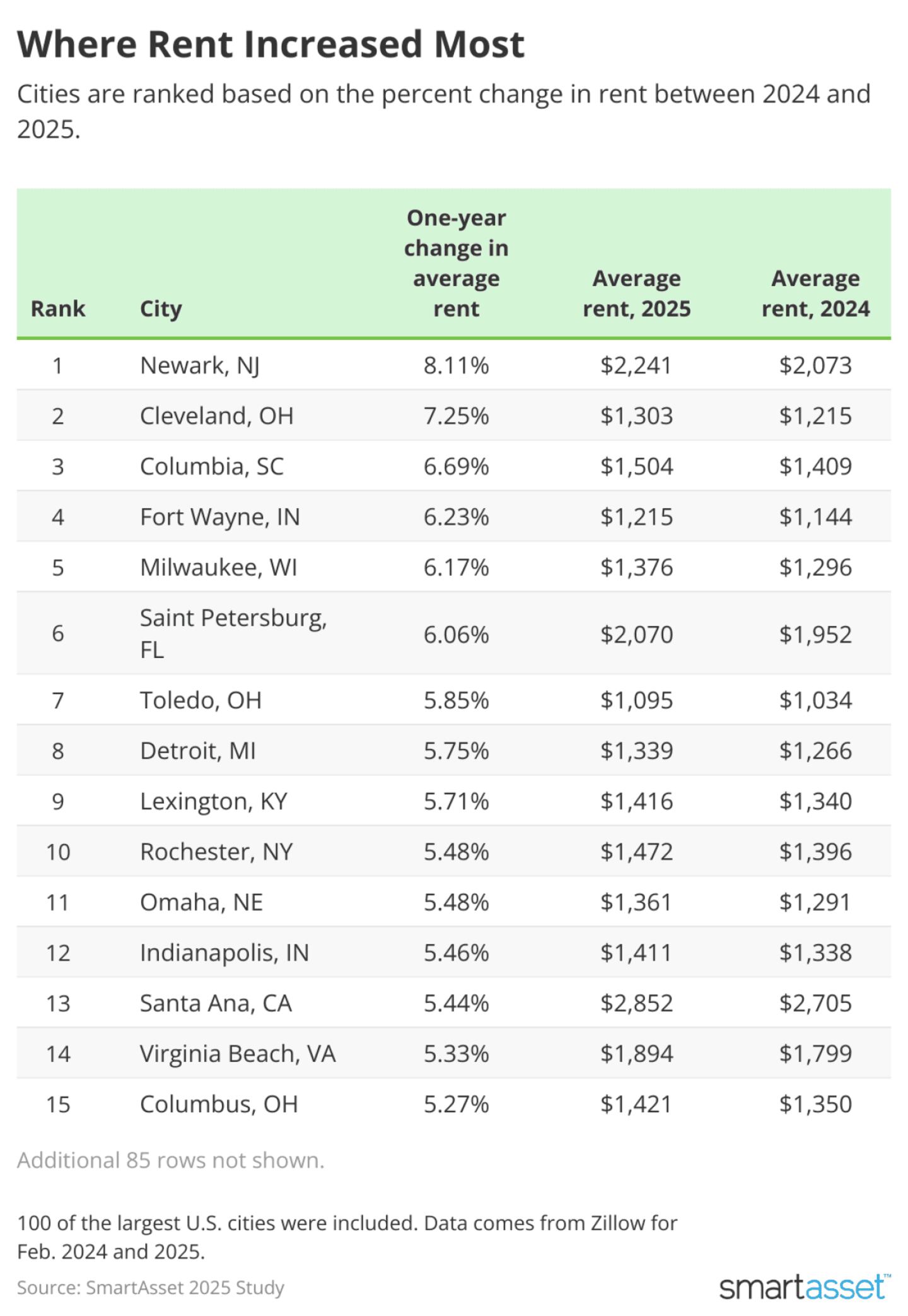Rental data used in this SmartAsset study comes from Zillow's Zillow Observed Rent Index (ZORI). Data as of February 2025, February 2024, and February 2020 was compared. Data represents average for all homes plus multifamilies for 100 of the largest U.S. cities, smoothed and seasonally adjusted.
