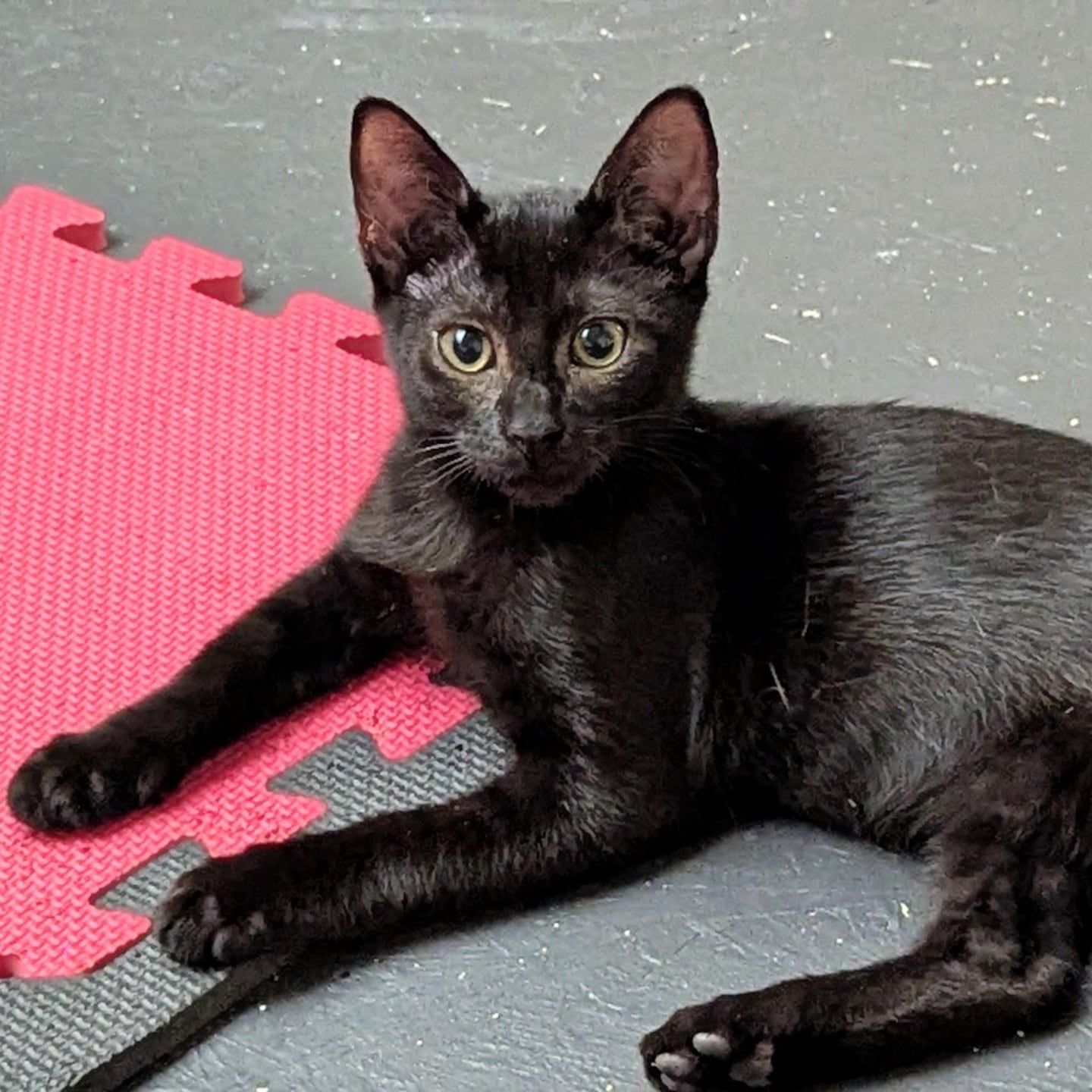 This four-month-old gorgeous gal is silky and sleek: Her fur is like velvet. And her personality is equally smooth. Cypress is smart, playful, with happy roots. She is a silly dilly who loves romping with her siblings and batting about any kind of toy. She can be a bit shy at first but bring out a feather wand or a springy thingy and Cypress will root herself right by your side.