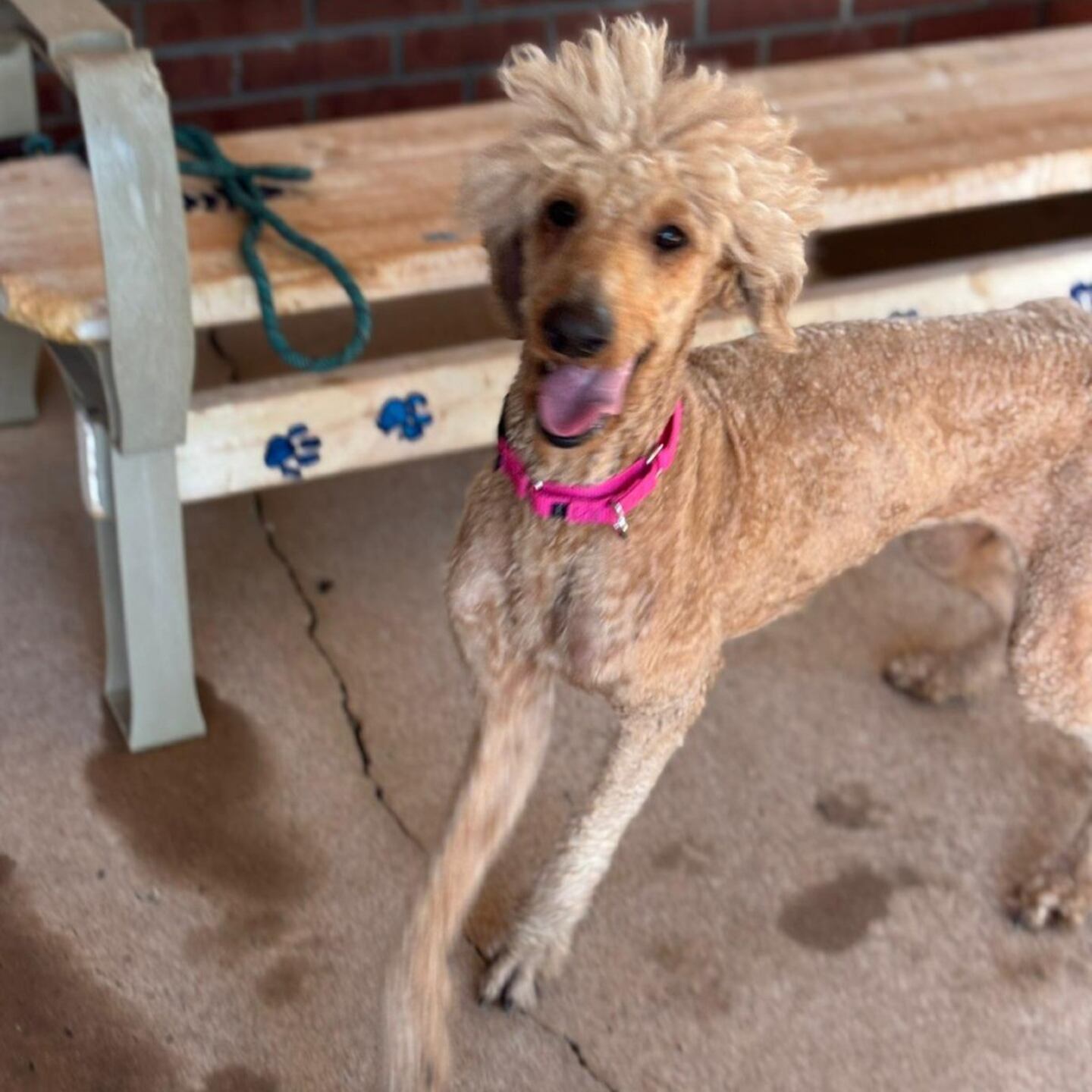 Autumn is a gorgeous Standard Poodle who is about three years old and 40 pounds. Like most Poodles, she has a really charming personality. She loves all people and is super affectionate. This Poodle will deliver kisses by the oodles! Every season, Autumn has a great spirit and loves to play. She’s crazy about toys—she’d prefer bushels of them! She enjoys them so much, at times, she doesn’t want to “leave” them…no matter what color they have turned!